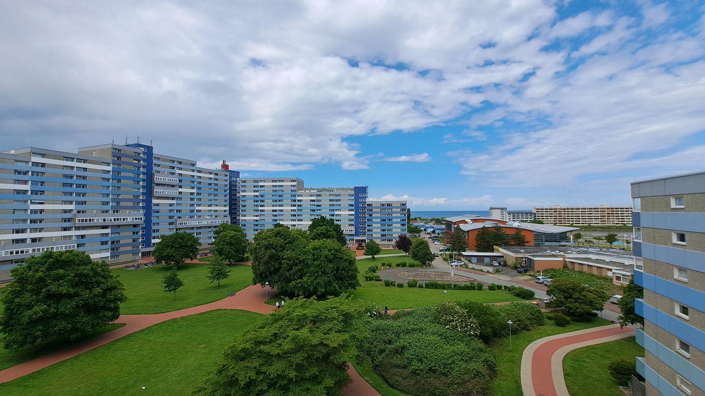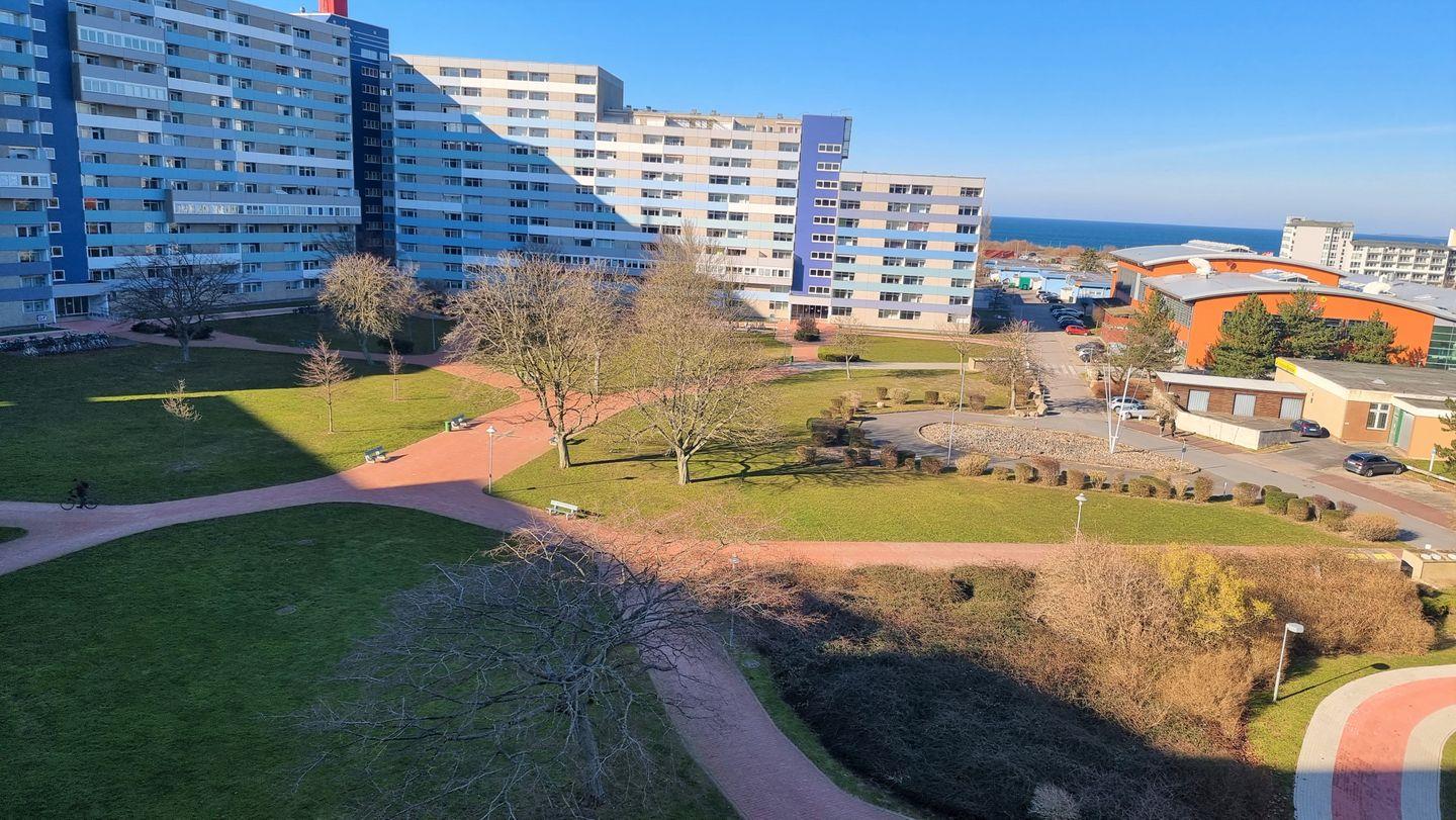 Modern ausgestattete Wohnung in der 6. Etage mit Blick in den Parkähnlich angelegten Innenhof bis zum Meer.