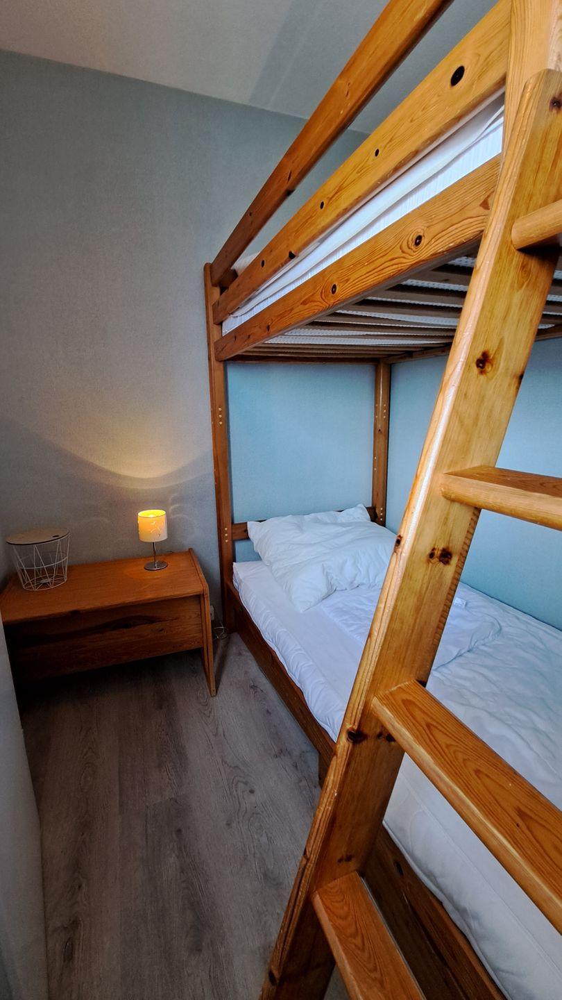 Der Kinderschlafbereich ist mit einer Tür zum Wohnbereich abgetrennt und mit einem Hochbett ausgestattet.