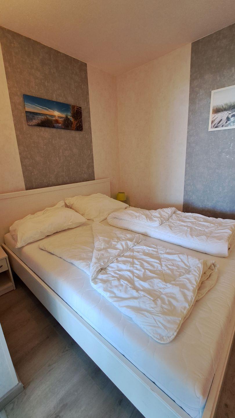 Im Schlafbereich welcher durch eine Tür zu erreichen ist, befinden sich ein Doppelbett (160cm x 200 cm) und eine kl. Kommode.