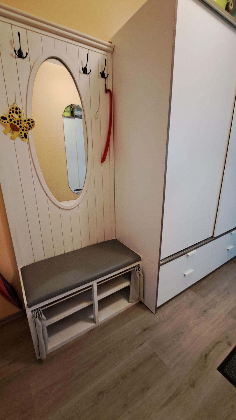 Das Bad ist hell gefliesten und mit Duschkabine, großem Spiegelschrank und WC ausgestattet.