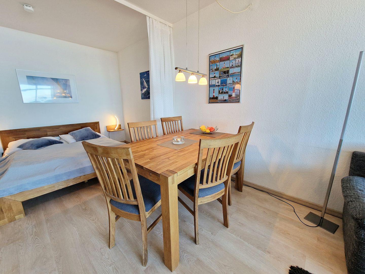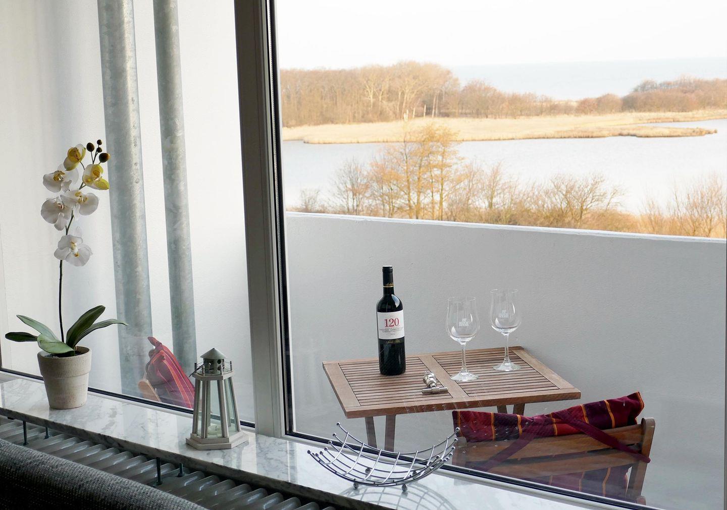 Draußen auf dem Balkon zur Nordseite können Sie die frische Meeresluft und den fantastischen Ausblick über die Salzwiesen bis zur Ostsee Richtung Insel Fehmarn genießen. In der Saison vom 15.05.-15.09. steht Ihnen zudem ein kostenfreier Strandkorb direkt am Strand zur Verfügung – ein wunderbarer Platz, um den Tag am Meer direkt ausklingen zu lassen.