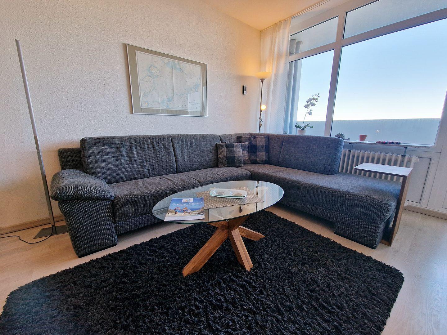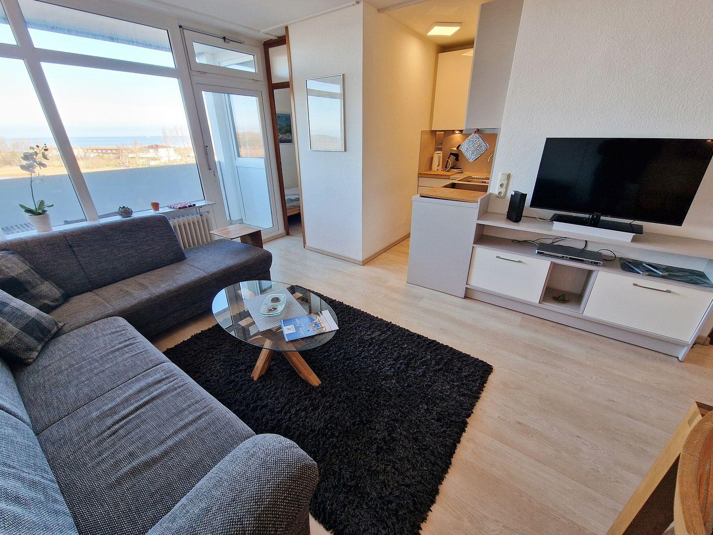 Der Wohnbereich ist geschmackvoll eingerichtet mit einer komfortablen Sofaecke, einem großen Flachbild-TV und einer integrierten Essecke – perfekt, um gemeinsam zu entspannen oder den Tag bei einem gemütlichen Abendessen ausklingen zu lassen. Dank des direkten Meerblicks, den Sie vom kleinen Balkon aus genießen, wird Ihr Aufenthalt hier zu etwas ganz Besonderem.