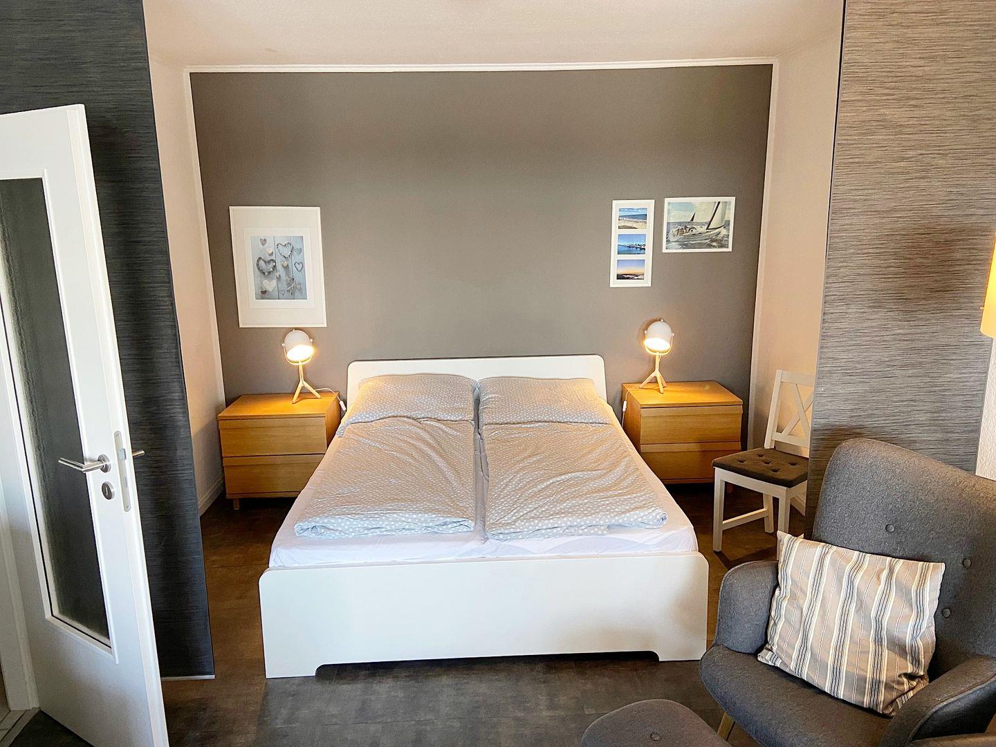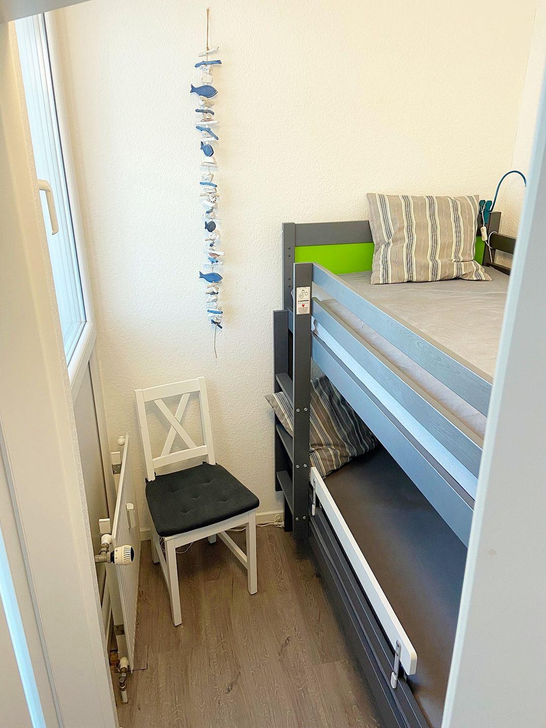 Schlafbereich mit neuem Doppelbett. Sep. Kinderzimmer mit Etagenbett.