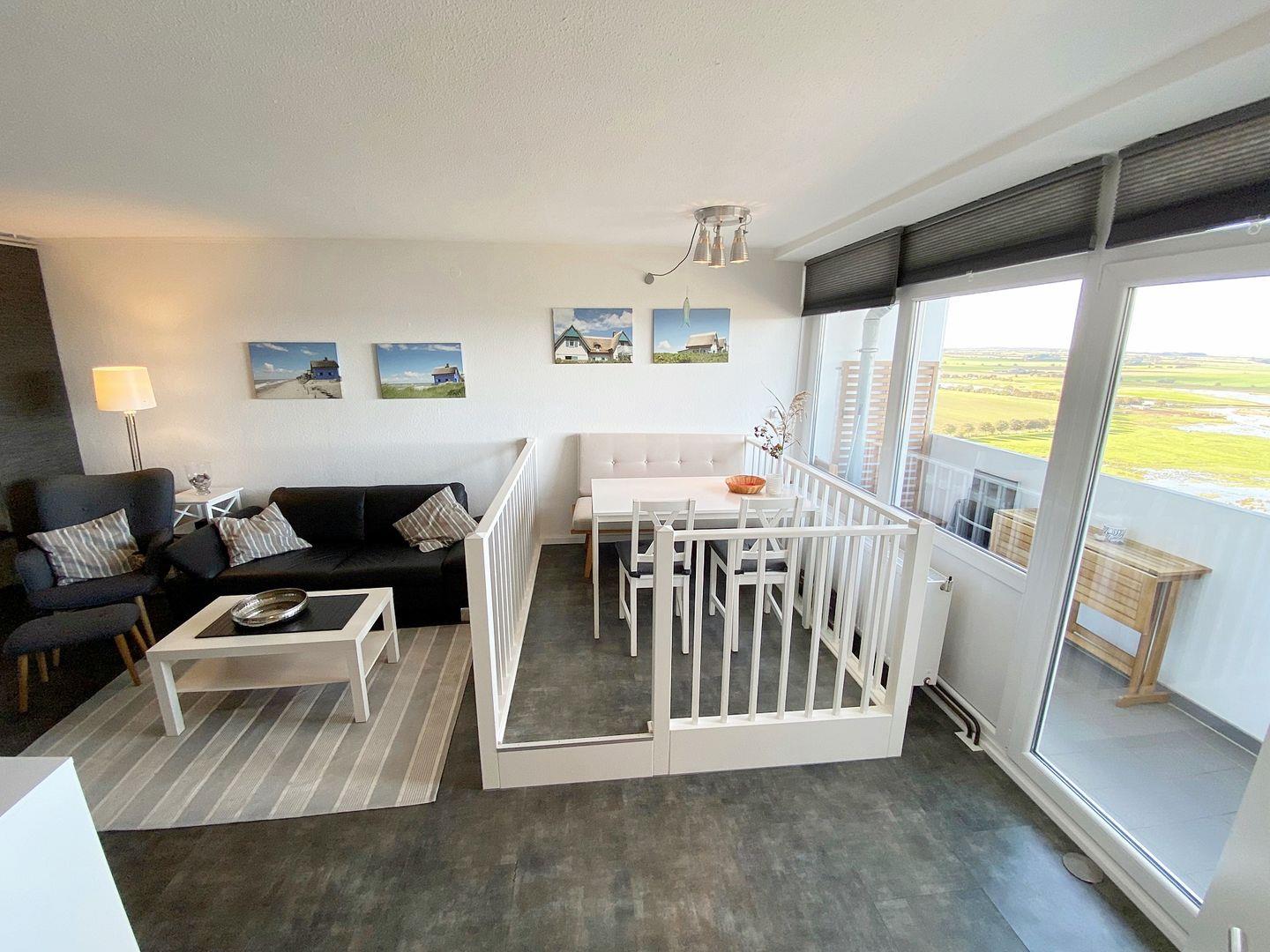 Freundliche und renovierte, mit Laminat ausgestattete, Ferienwohnung in der 14. Etage mit Balkon zur Westseite und einem traumhaft schönem Blick über das Naturschutzgebiet in Richtung Leuchtturm/Ostsee.