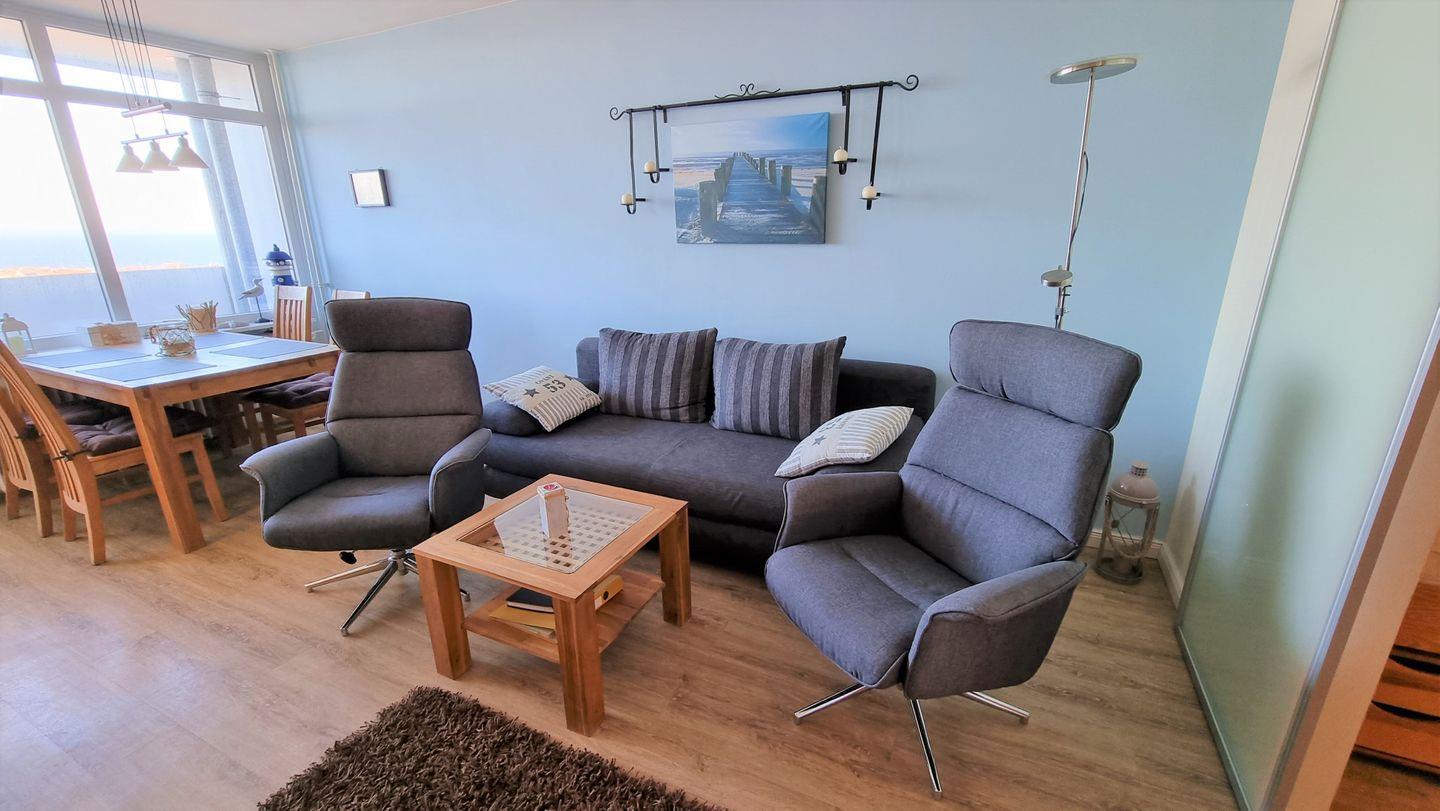 Der Wohnbereich ist in stilvollem Blau eingerichtet und mit einem gemütlichen 3-Sitzer-Sofa sowie zwei komfortablen Relax Sesseln ausgestattet. Ein LCD-TV, eine Musikanlage und die Essecke direkt am Fenster sorgen für eine angenehme Wohnatmosphäre und laden zu entspannten Abenden ein. Die helle Küche ist funktional eingerichtet und bietet alles, was Sie für die Zubereitung Ihrer Mahlzeiten benötigen. Zur Ausstattung gehören ein 4-Platten-Ceranfeld, eine Mikrowelle, ein Geschirrspüler, ein Backofen in angenehmer Arbeitshöhe sowie ein Kühlschrank mit Gefrierfach.