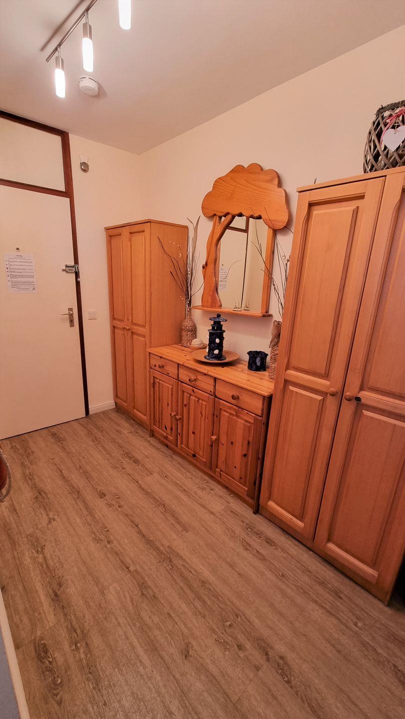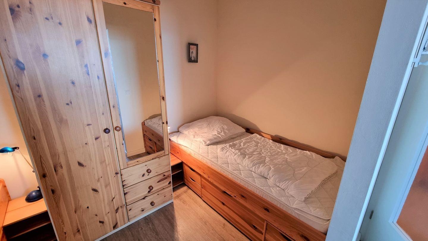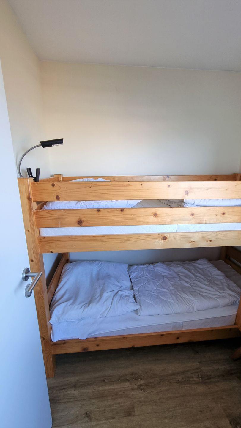 Der Schlafbereich ist mit zwei Einzelbetten und einem Kleiderschrank ausgestattet und bietet eine ruhige Rückzugsmöglichkeit für erholsame Nächte. Zusätzlich steht ein separates Kinderzimmer mit Etagenbett zur Verfügung – ideal für Familien mit Kindern. Das helle Badezimmer verfügt über eine Duschkabine und ein modernes Hänge-WC und rundet den komfortablen Eindruck der Wohnung ab. Die Wohnung ist eine Nichtraucherunterkunft, und Haustiere sind nicht erlaubt. Kostenfreie Parkplätze stehen in unmittelbarer Nähe der Anlage zur Verfügung.