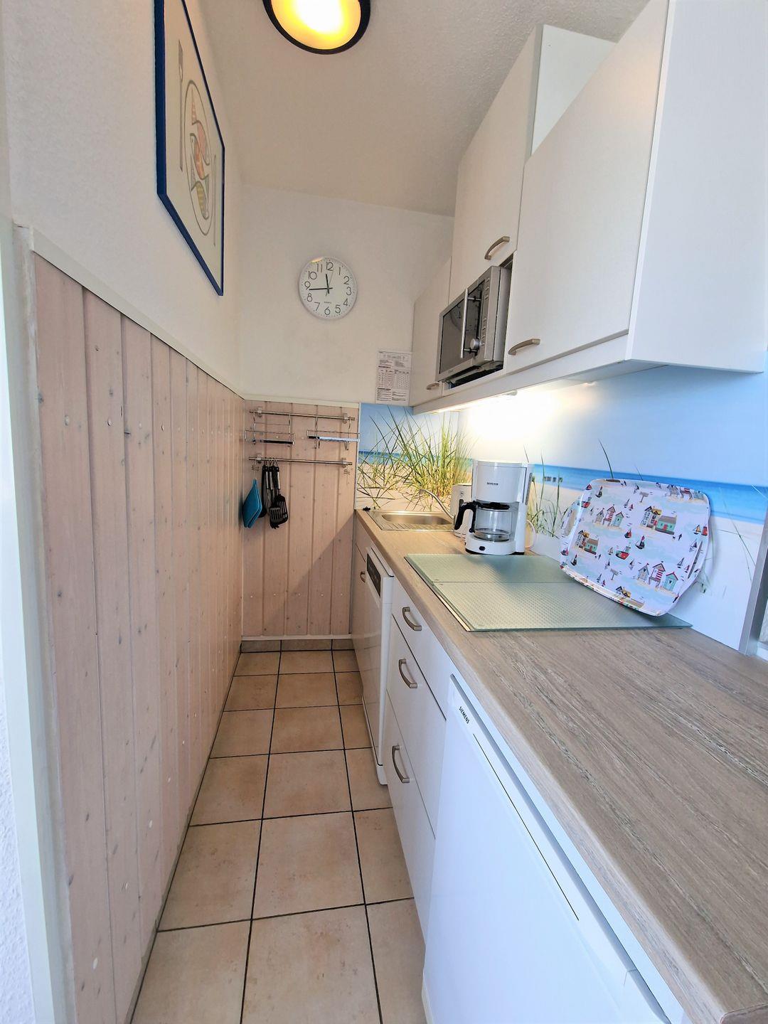 Die zum Wohnraum offene, moderne Küche ist mit einem Cerankochfeld (4 Platten), Mikrowelle (mit Backofenfunktion), Spülmaschine, Kühlschrank mit Gefrierfach, Geschirr/Besteck und ausreichend Küchenutensilien ausgestattet.