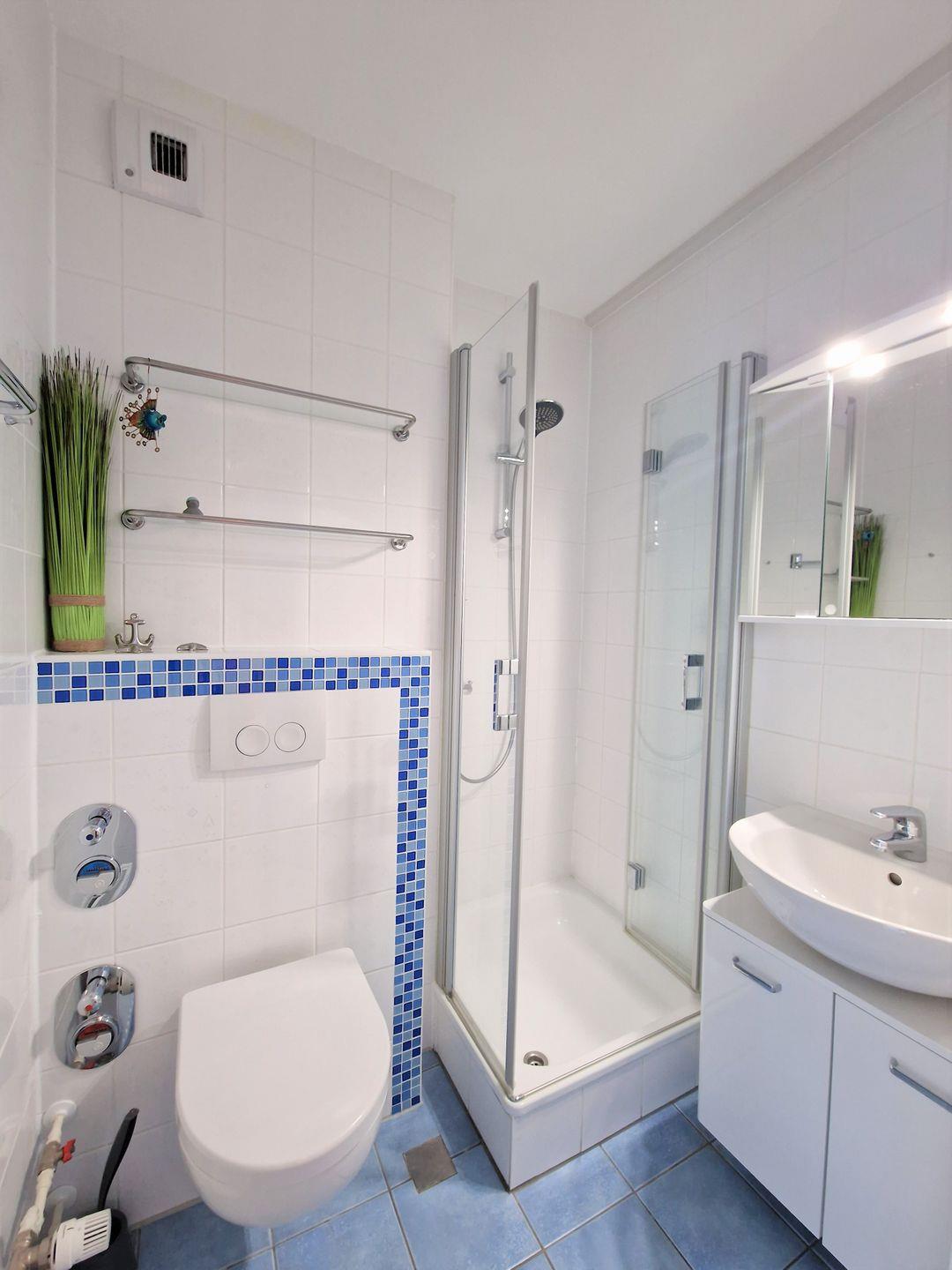 Das Badezimmer ist hell und modern eingerichtet und verfügt über ein WC, eine Dusche (Duschkabine, hoher Einstieg), Fön, Kosmetikspiegel.