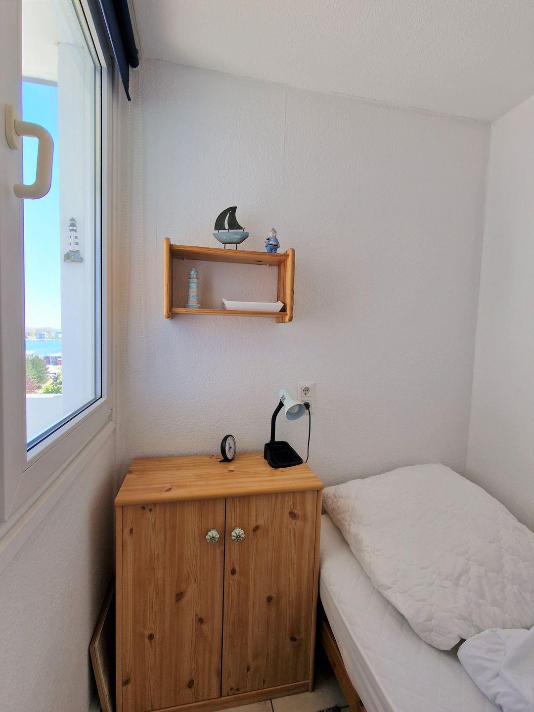 Das sep. Kinderzimmer (durch eine Tür zum Wohnbereich getrennt) verfügt über ein Einzelbett (90*200). Das Kinderzimmer ist am Fenster durch ein Rollo verdunkelbar.