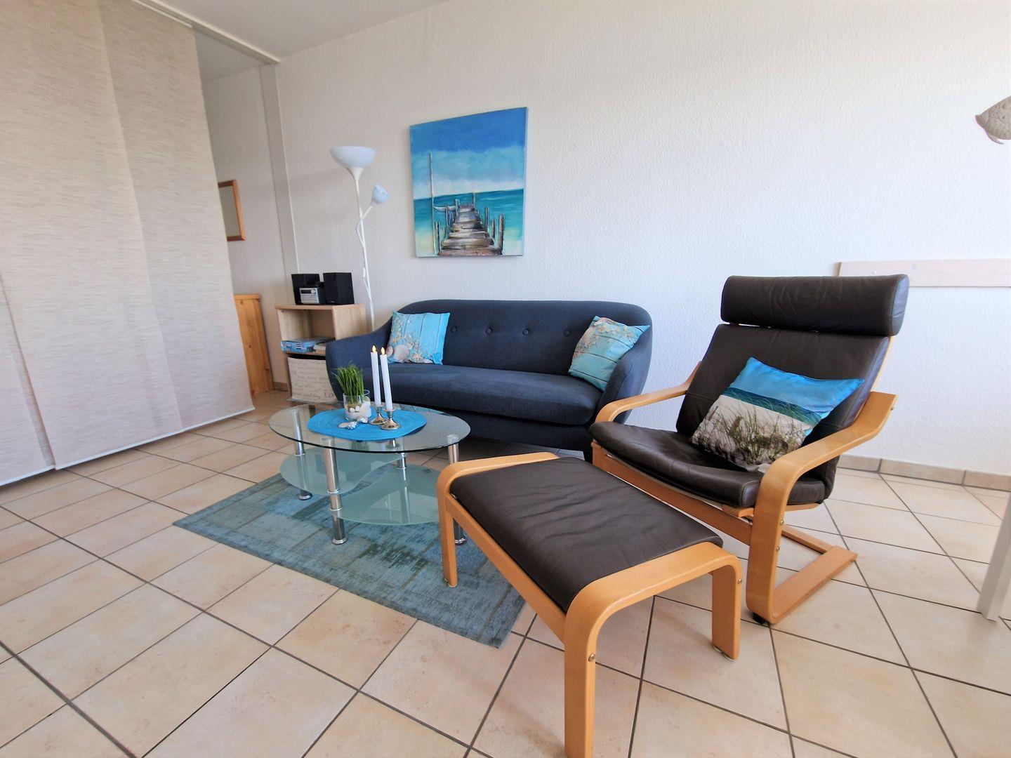 Der Wohnraum ist mit einem 3-Sitzer und einem gemütlichen Sessel hergerichtet. Das LCD-TV (81cm), DVD/CD-Player sowie einer Musikanlage stehen zur Verfügung.