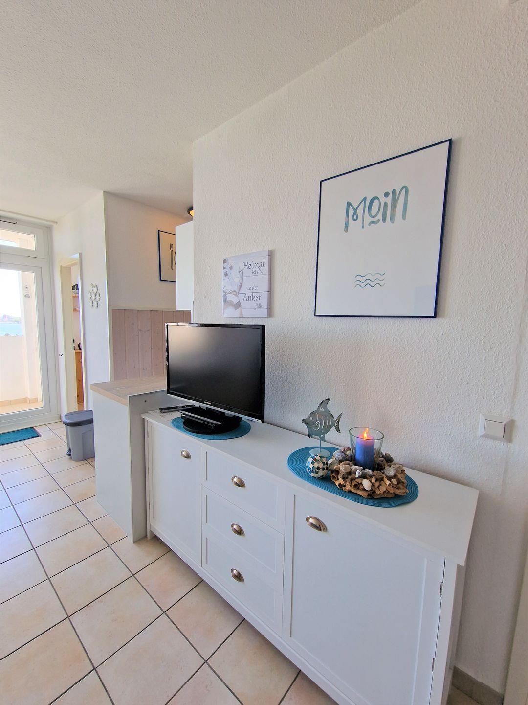 Moderne, sehr schöne und helle Ferienwohnung in der 7. Etage mit Balkon zum Innenhof und Blick über den Binnensee Richtung Stadt Heiligenhafen.