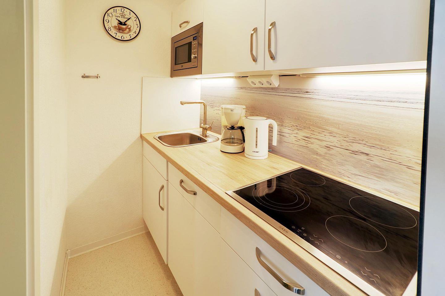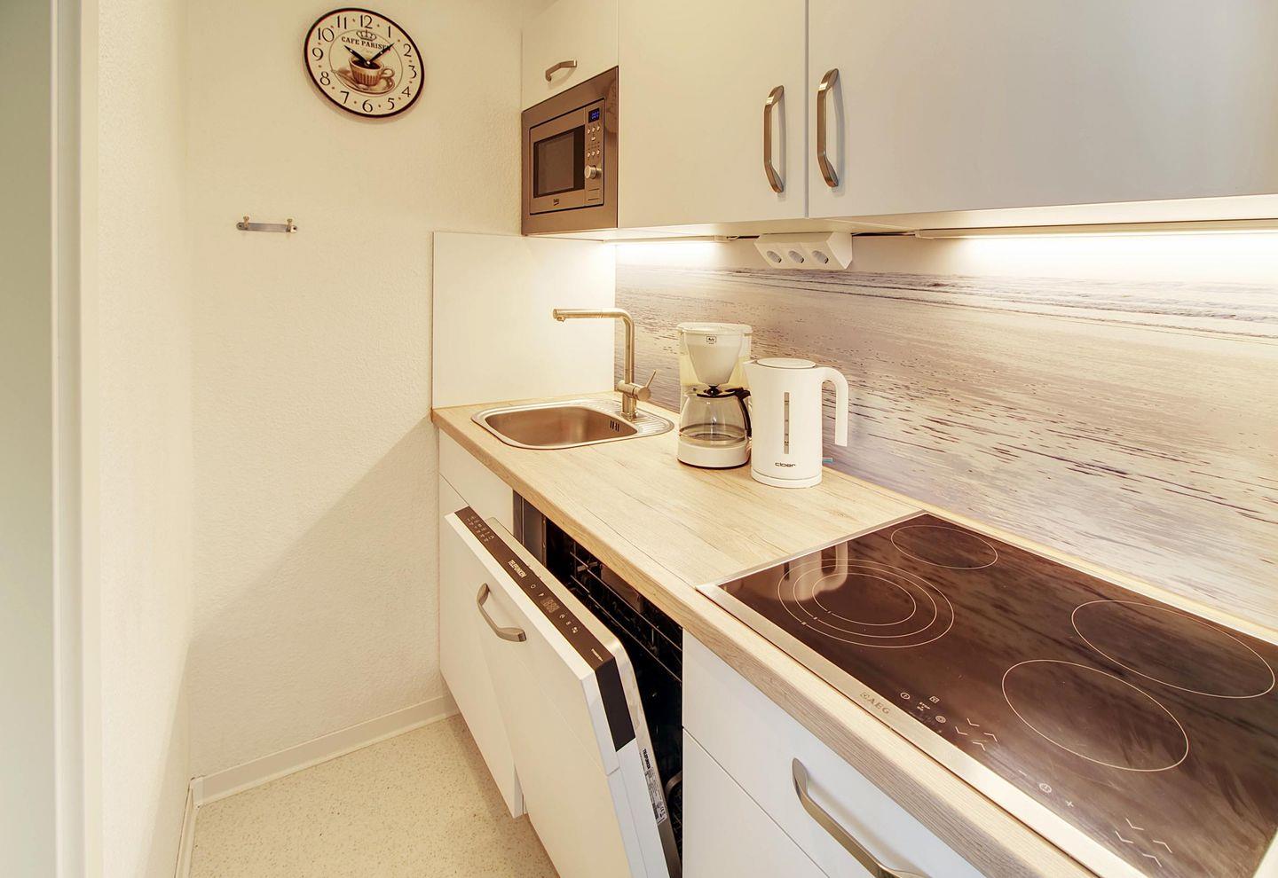 Küche mit 4er Ceranfeld und Kühlschrank mit Gefrierfach, sowie Mikrowelle und Geschirrspüler.