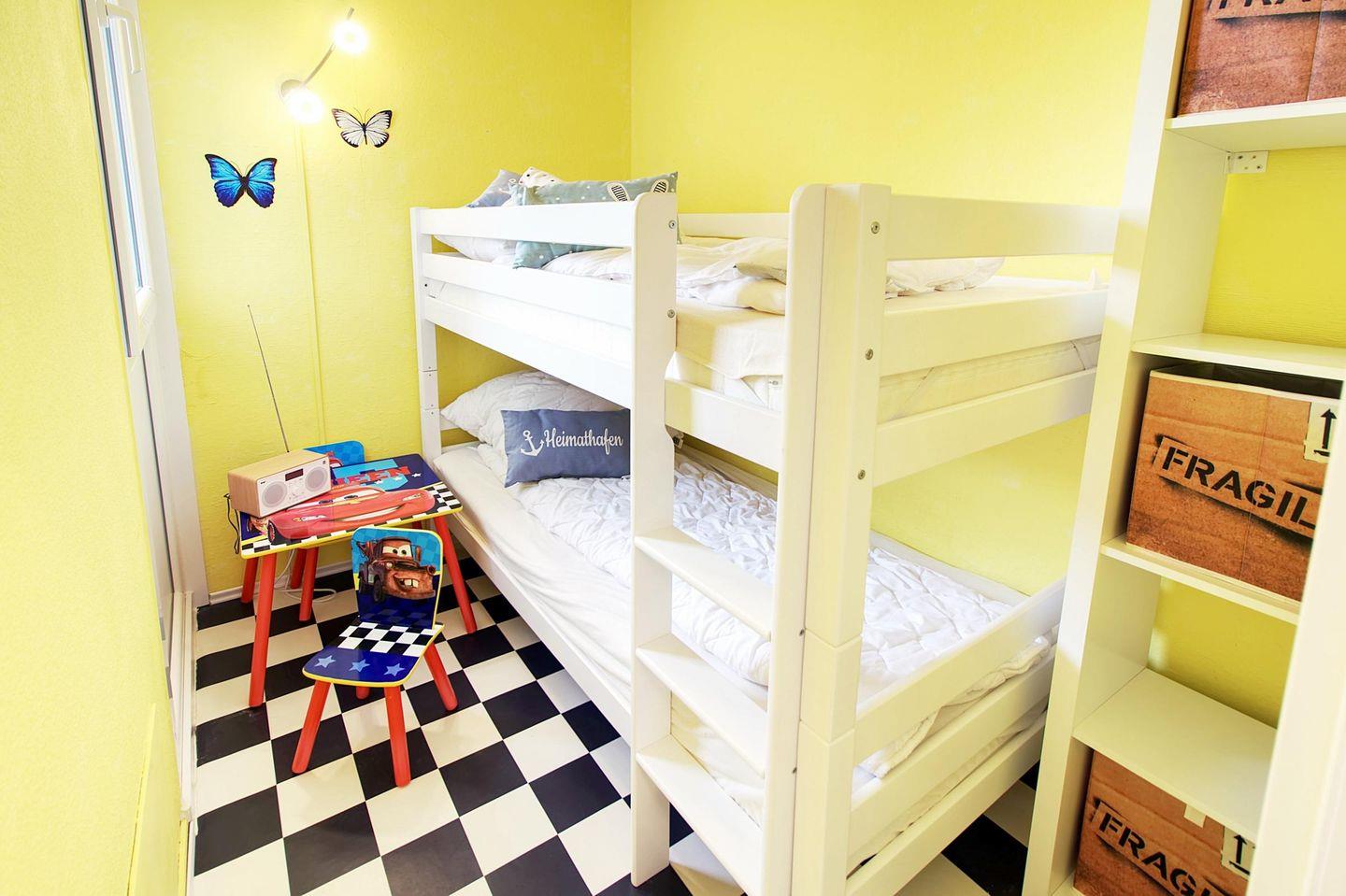 Kinderzimmer mit Etagenbett (90 x 200cm), Fenster und einer Tür zur Küche.