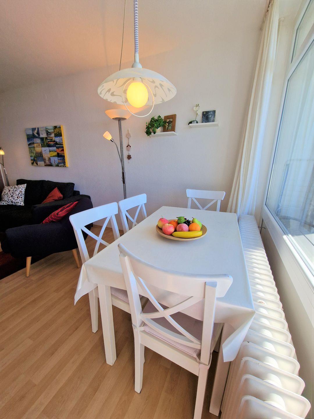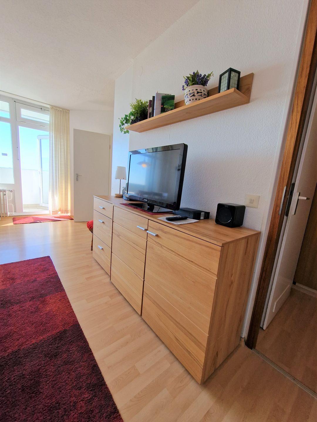 Wohnbereich mit 3er Couch und Sessel, TV und Musikanlage mit CD u.USB. Die Essecke befindet sich direkt am Fenster- Sie geniessen beim Essen den Weitblick.