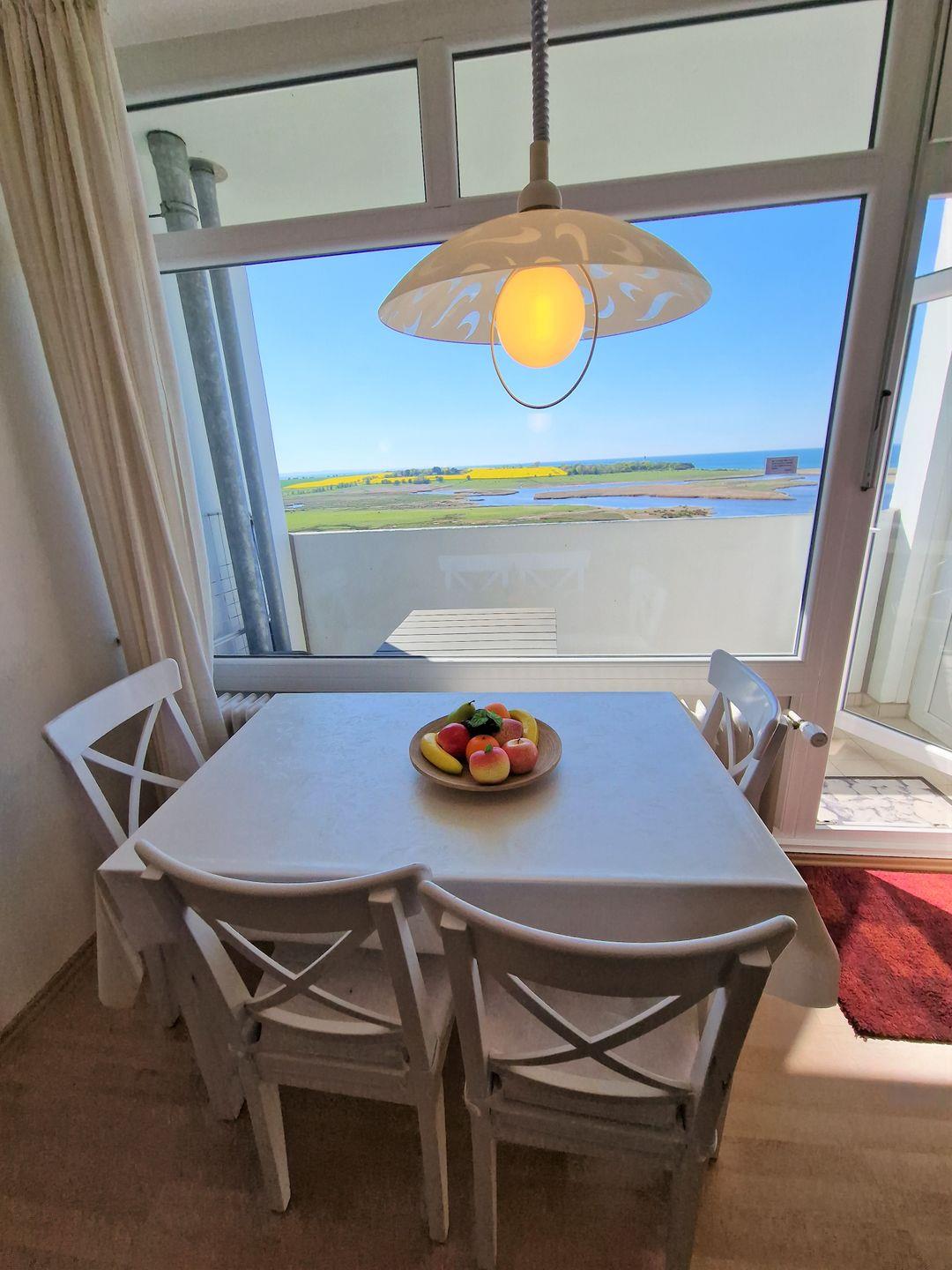 Sonnige und freundlich ausgestattete Wohnung in der 8. Etage mit Balkon zur Westseite mit herrlichem Seeblick über das Naturschutzgebiet in Richtung Leuchtturm/Ostsee.