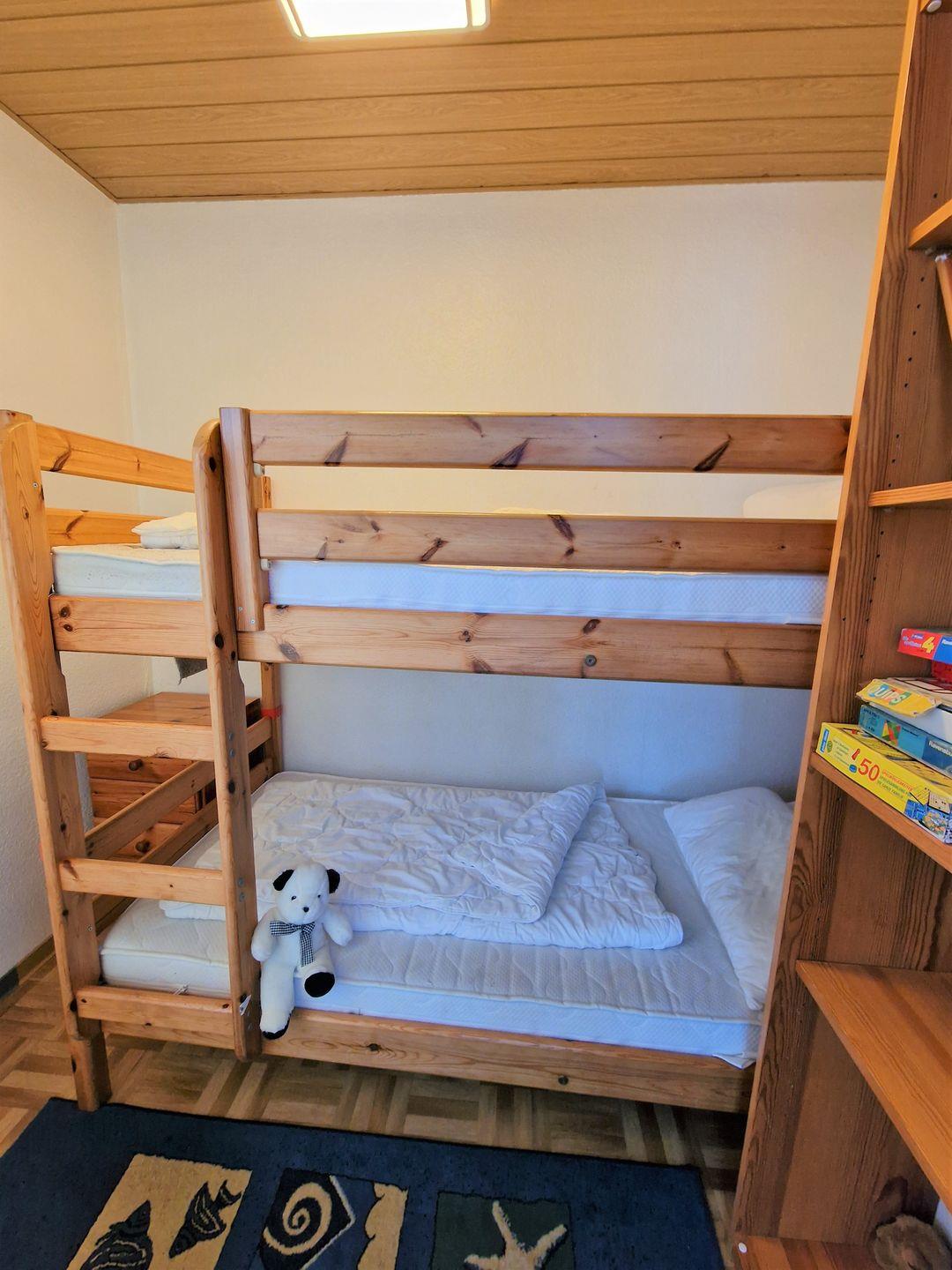 Die Schlafbereiche sind zweckmäßig durchdacht: Ein separiertes Kinderzimmer mit großem Etagenbett (0,9 x 2m) bietet den Kleinen ihren eigenen Rückzugsort, während der Schlafbereich mit zwei komfortablen Einzelbetten (1,20 x 2m) durch einen Vorhang vom Wohnraum separiert ist und so für erholsame Nächte sorgt. Ein funktionales Badezimmer mit Dusche und WC ergänzt die Wohnung und sorgt für praktischen Komfort während Ihres Aufenthalts.
