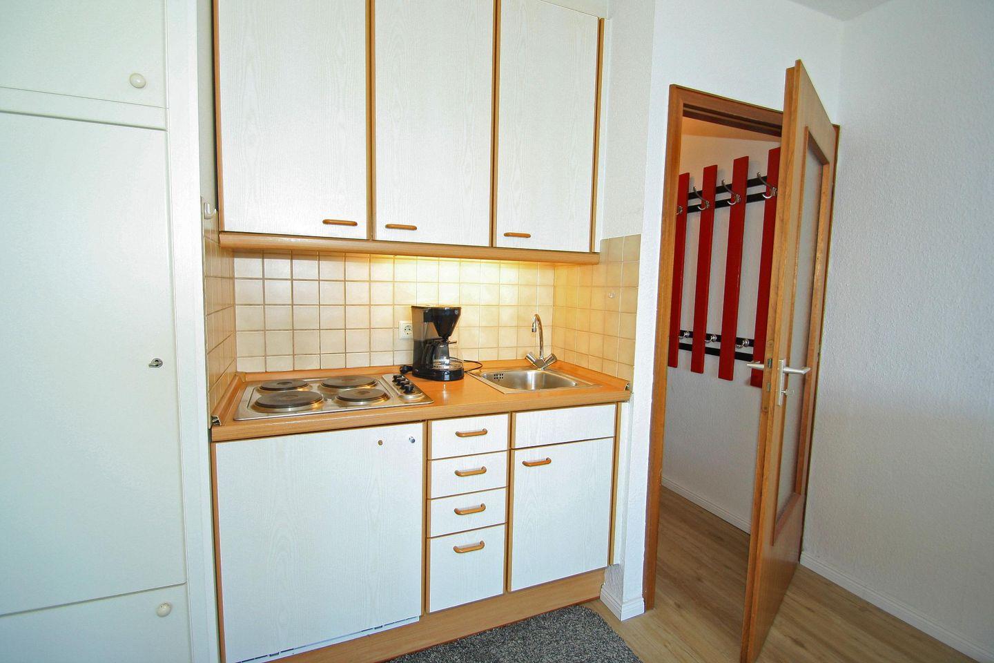 Küchenzeile mit 4 Plattenherd, Kaffeemaschine und Kühlschrank mit Gefrierfach.