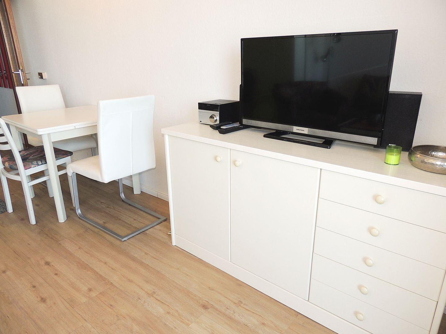 Kombinierter Wohn-/Schlafbereich mit Doppelschrankbett (je 80xca.190cm) und 2 Sesseln, neuem 80cm LCD-TV, kleiner Essecke