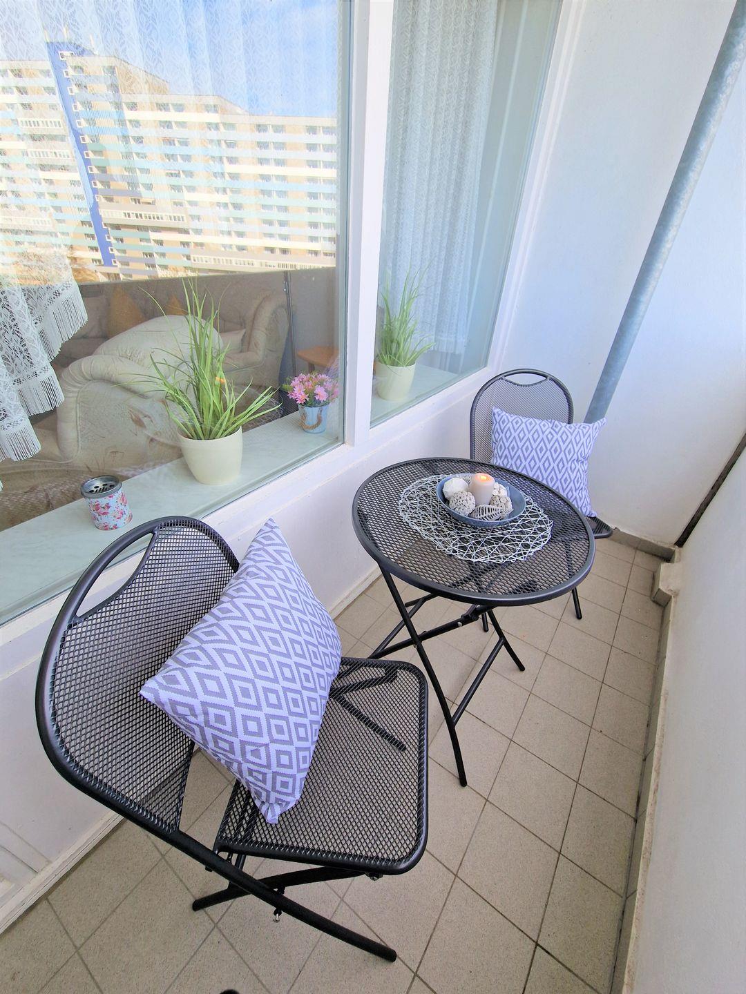 Auf dem Balkon laden 1 Tisch und 2 Stühle zum Verweilen ein.