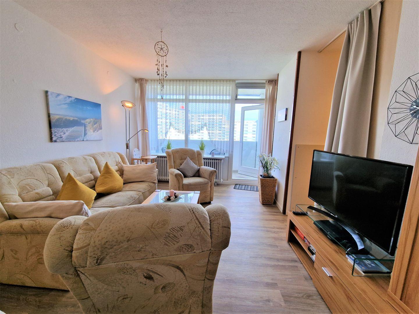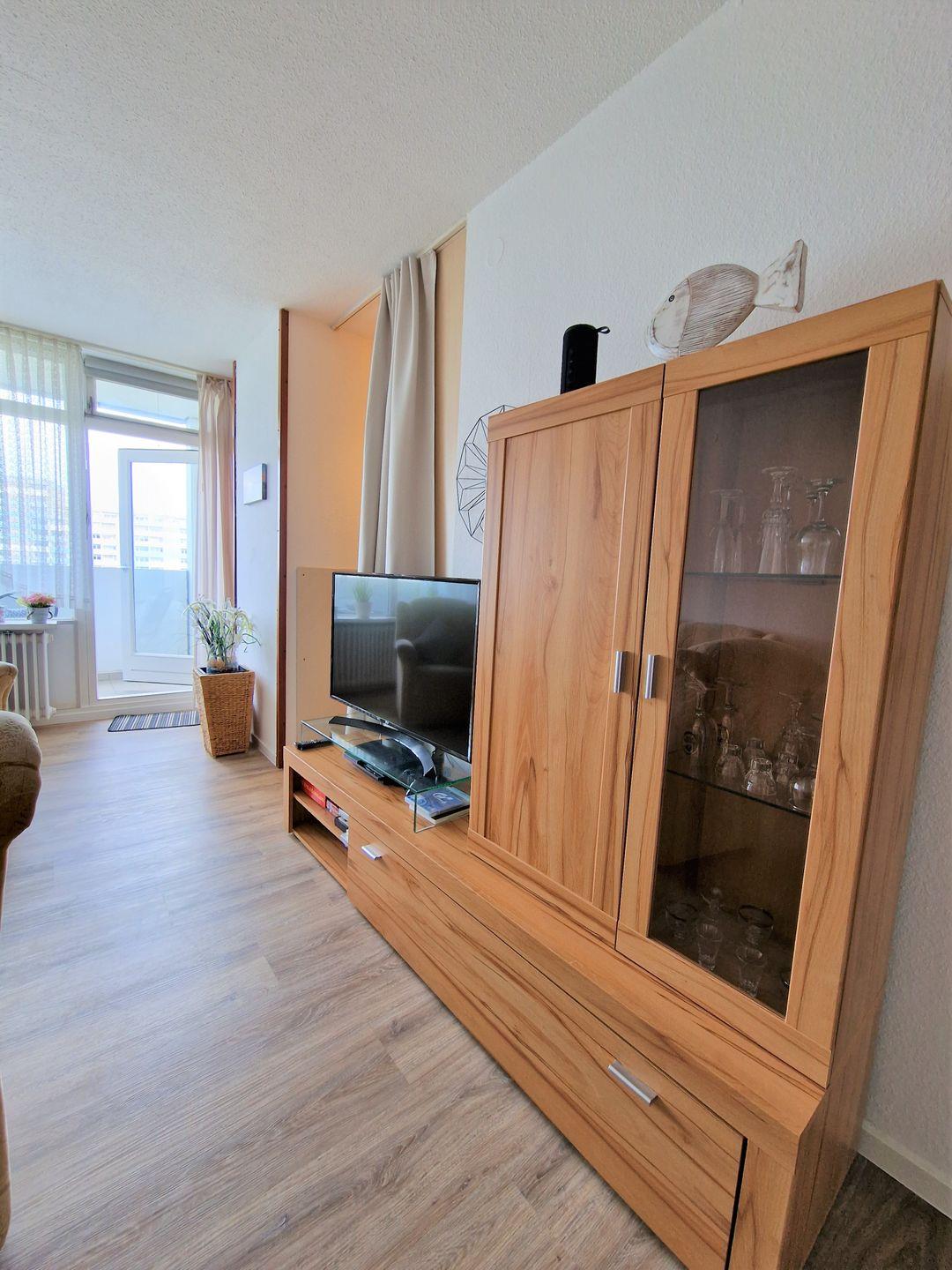 Freundlich ausgestattete Wohnung in der 6. Etage mit Blick über den parkähnlich angelegten Innenhof bis hin zur Fehmarn Sundbrücke.