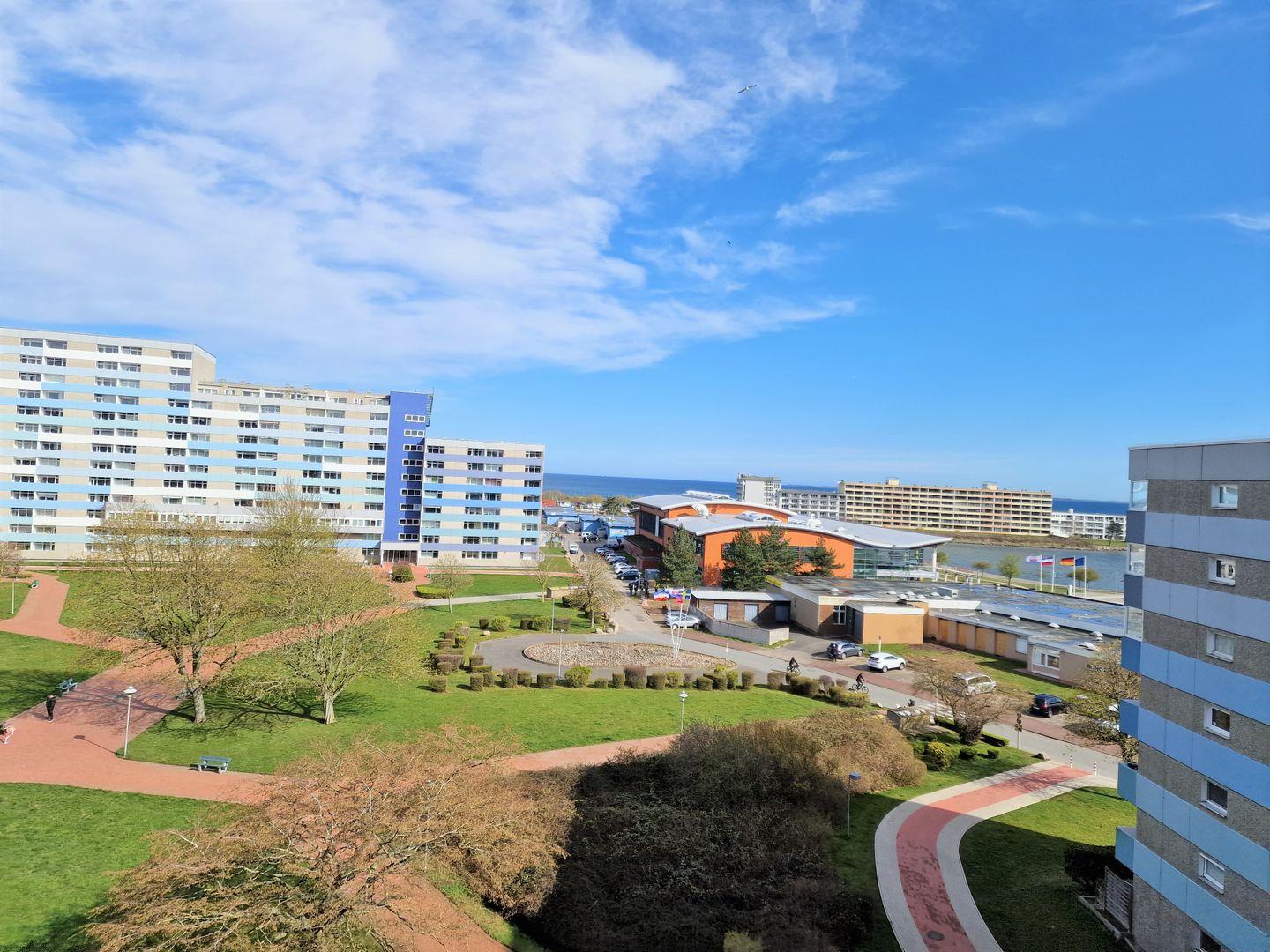 Freundlich ausgestattete Wohnung in der 6. Etage mit Blick über den Parkähnlich angelegten Innenhof bis hin zur Fehmarn Sundbrücke.