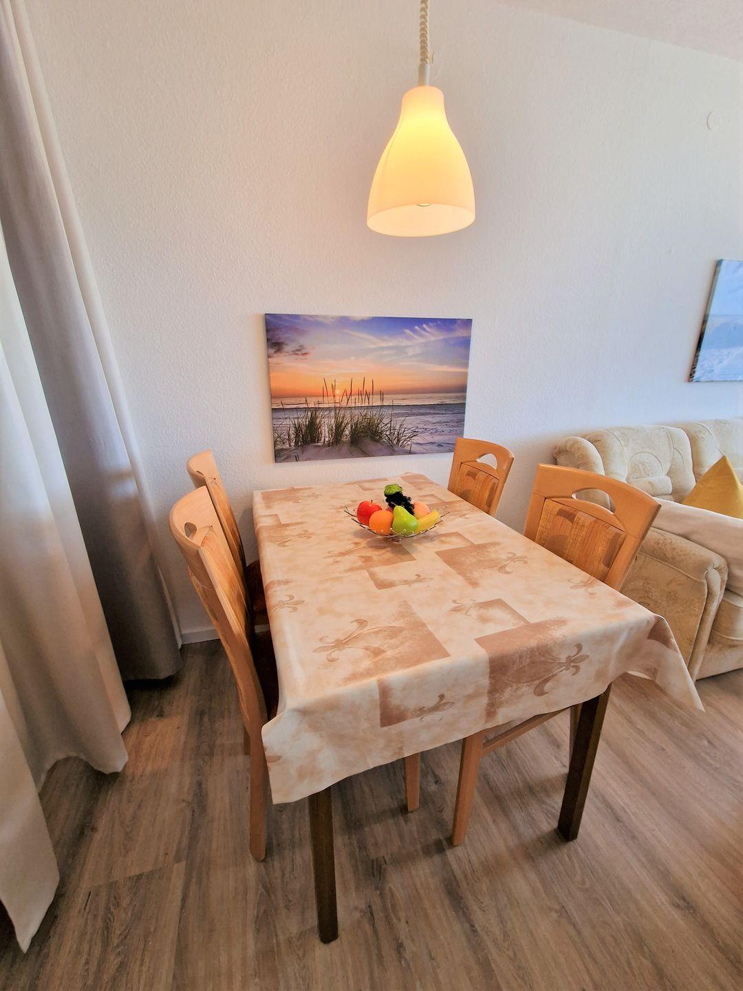 Ein großer Esstisch mit 4 Stühlen befindet sich im hinteren Wohnbereich.