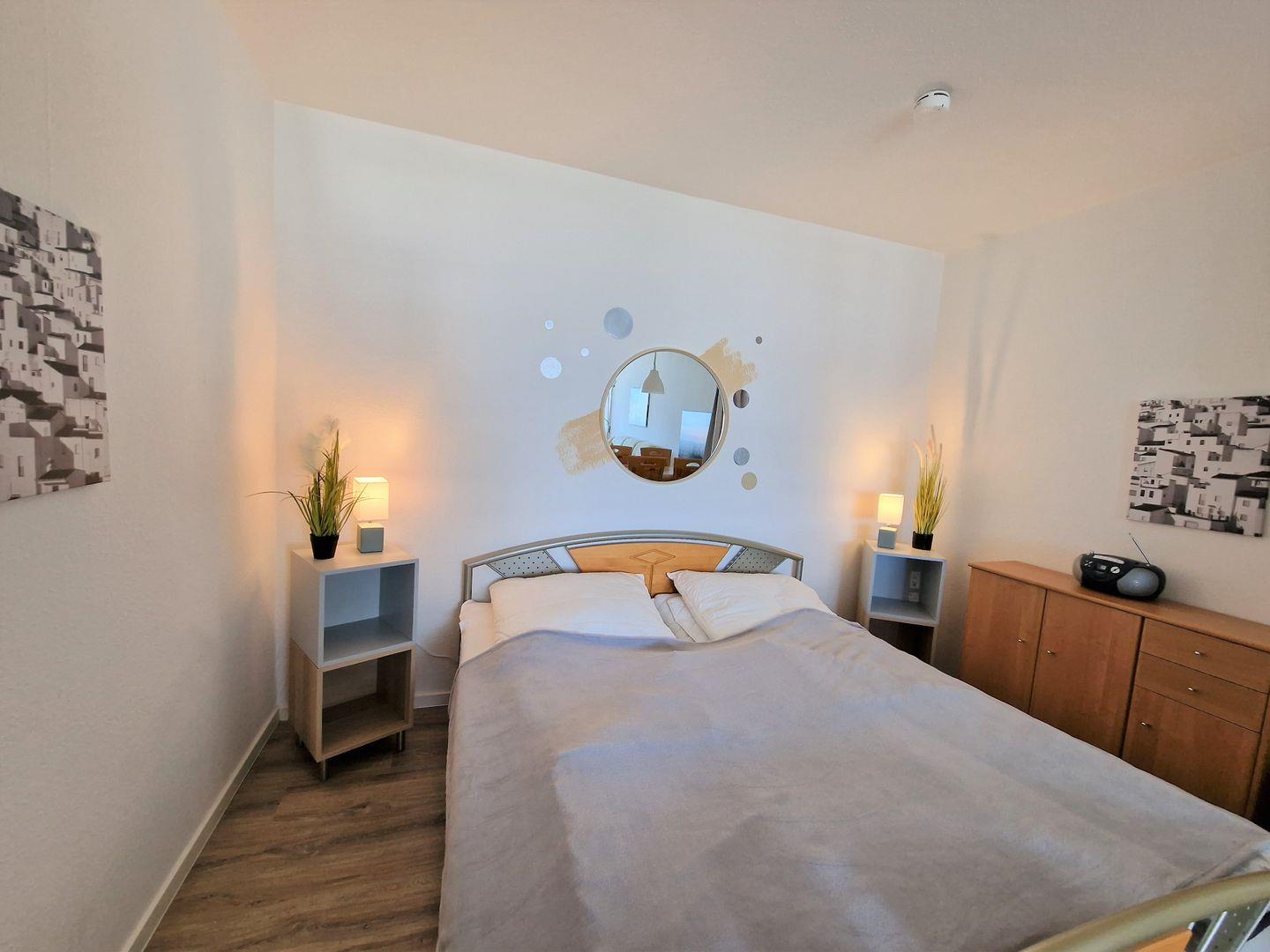 Im Schlafbereich, welcher durch einen abdunkelnden Vorhang vom Wohnbereich abgetrennt ist, befindet sich ein Doppelbett, zwei kl. Nachttische und ein Sideboard.