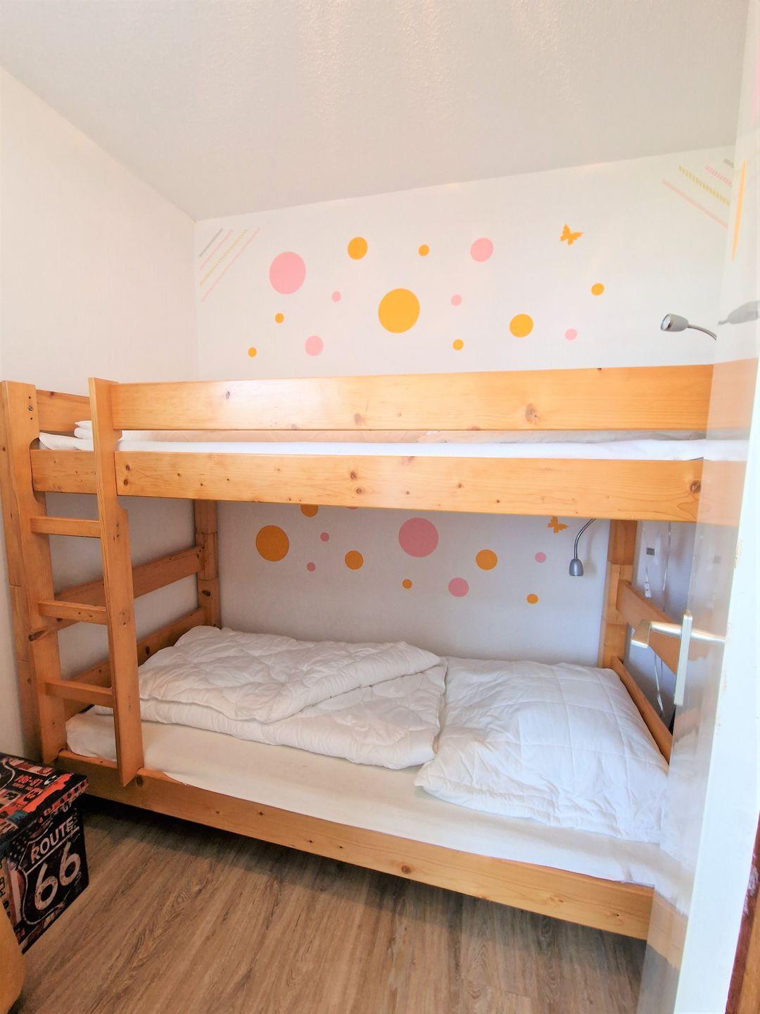 Das Kinderschlafzimmer ist mit einer Tür vom Wohnbereich abgetrennt und mit einem Hochbett ausgestattet.