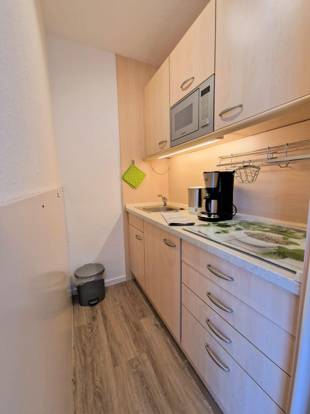 In der Küche befinden sich ein Ceranfeld, Mikrowelle, Kaffeemaschine und Kühlschrank mit Gefrierfach sowie auch eine Heißluftfriteuse von TEFAL.