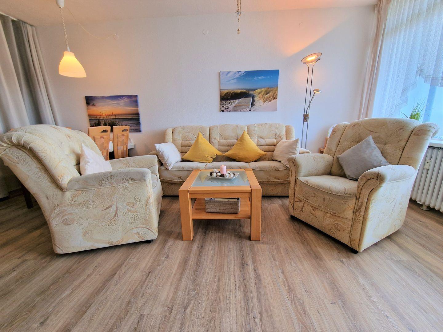 Das Wohnzimmer ist mit einer hellen ausziehbaren Stoffcouch (3-Sitzer, 2 Sessel) und einer kleinen Schrankwand ausgestattet.