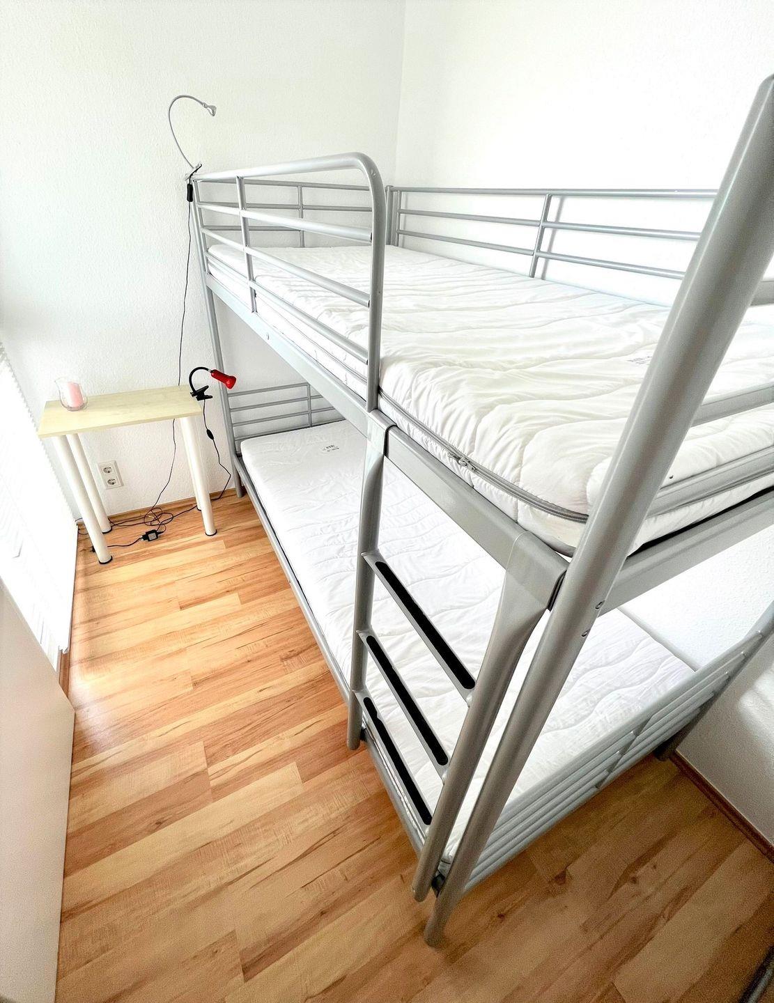 Der Schlafbereich hat ein 180x200 cm Doppelbett, das mit einer Tür getrennte Kinderzimmer verfügt über ein Etagenbett mit 90x200 cm Matratzengröße und hohem Einstieg. Hier kann unten auch bequem ein Erwachsener schlafen.
