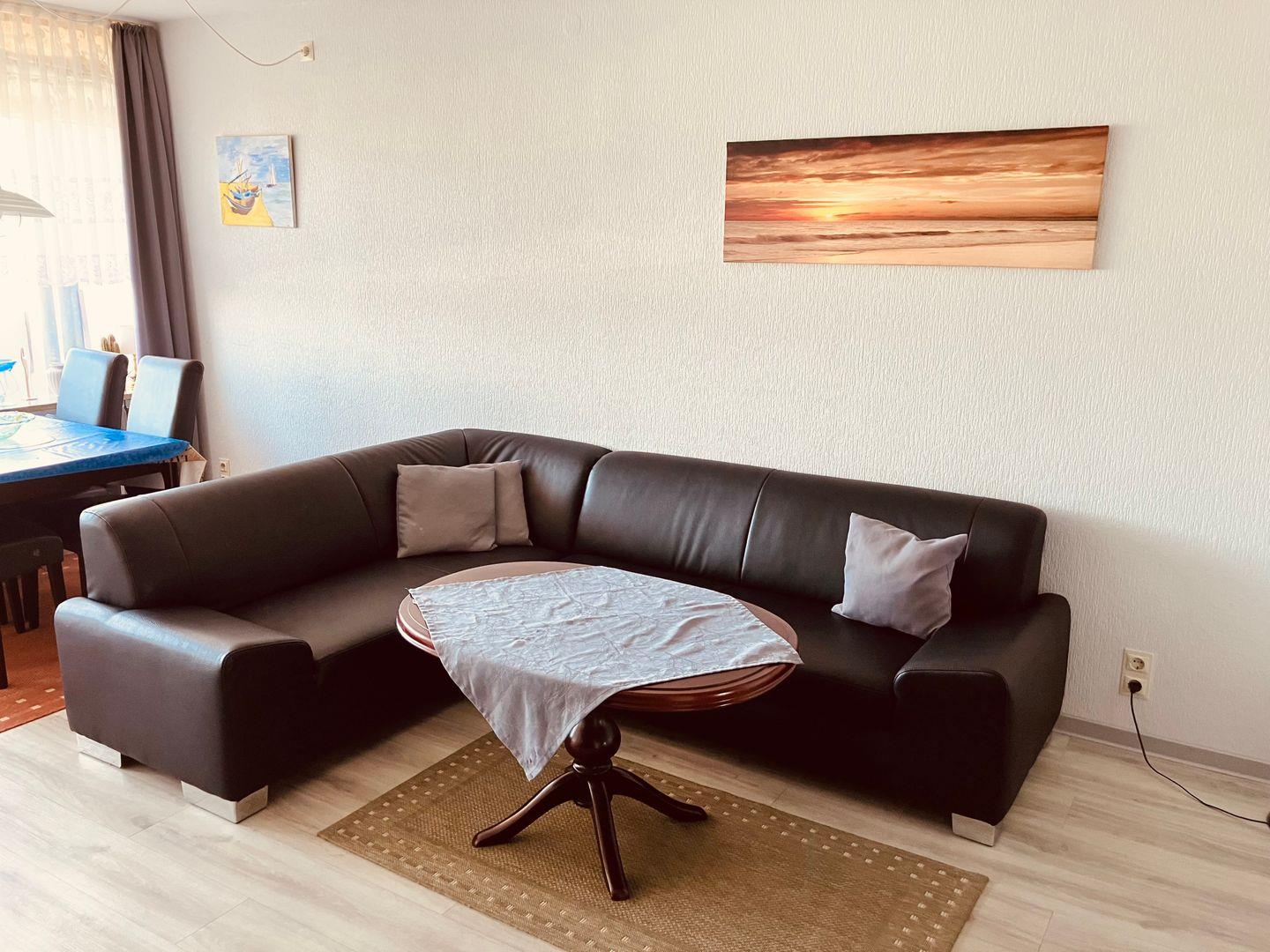 Der Wohnbereich ist mit einer roten Ledercouch über Eck, 81cm Flachbildschirm, DVD-& BluRay-Player und einer Musikanlage mit CD ausgestattet.