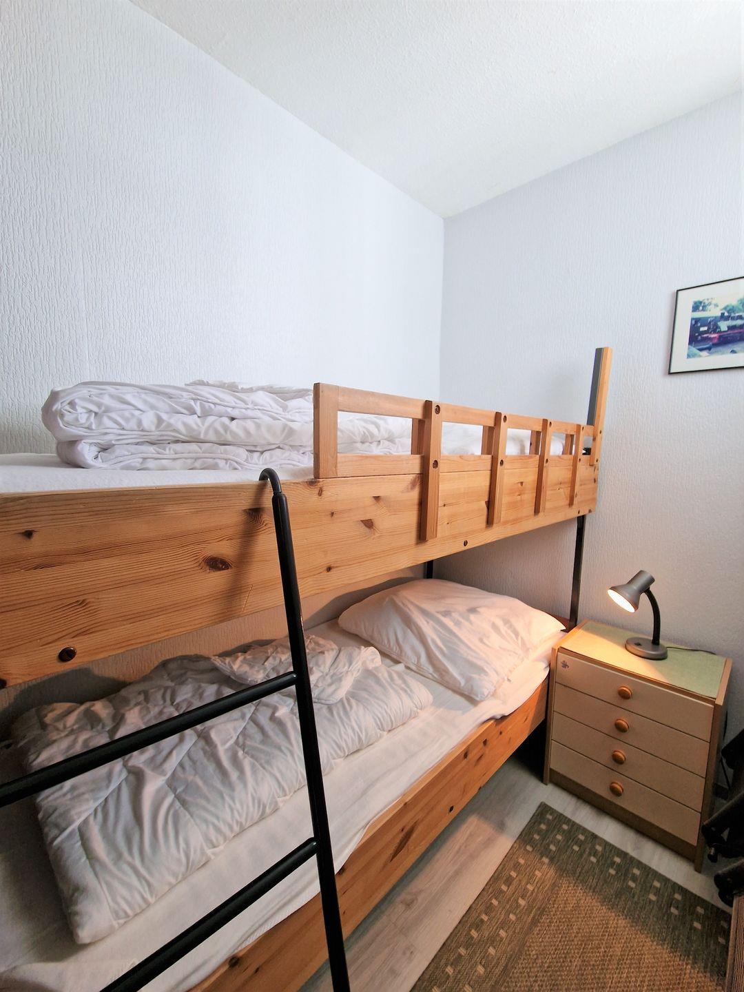 Sep. Kinderzimmer mit Etagenbett (offen zur Küche, dann Tür zum Wohnzimmer).