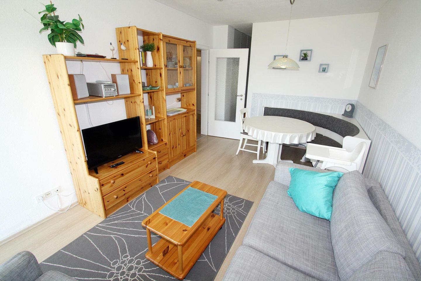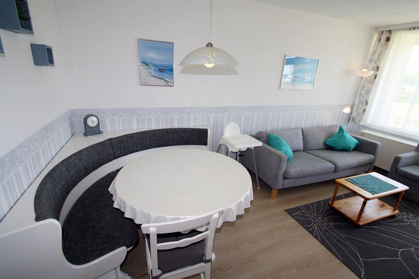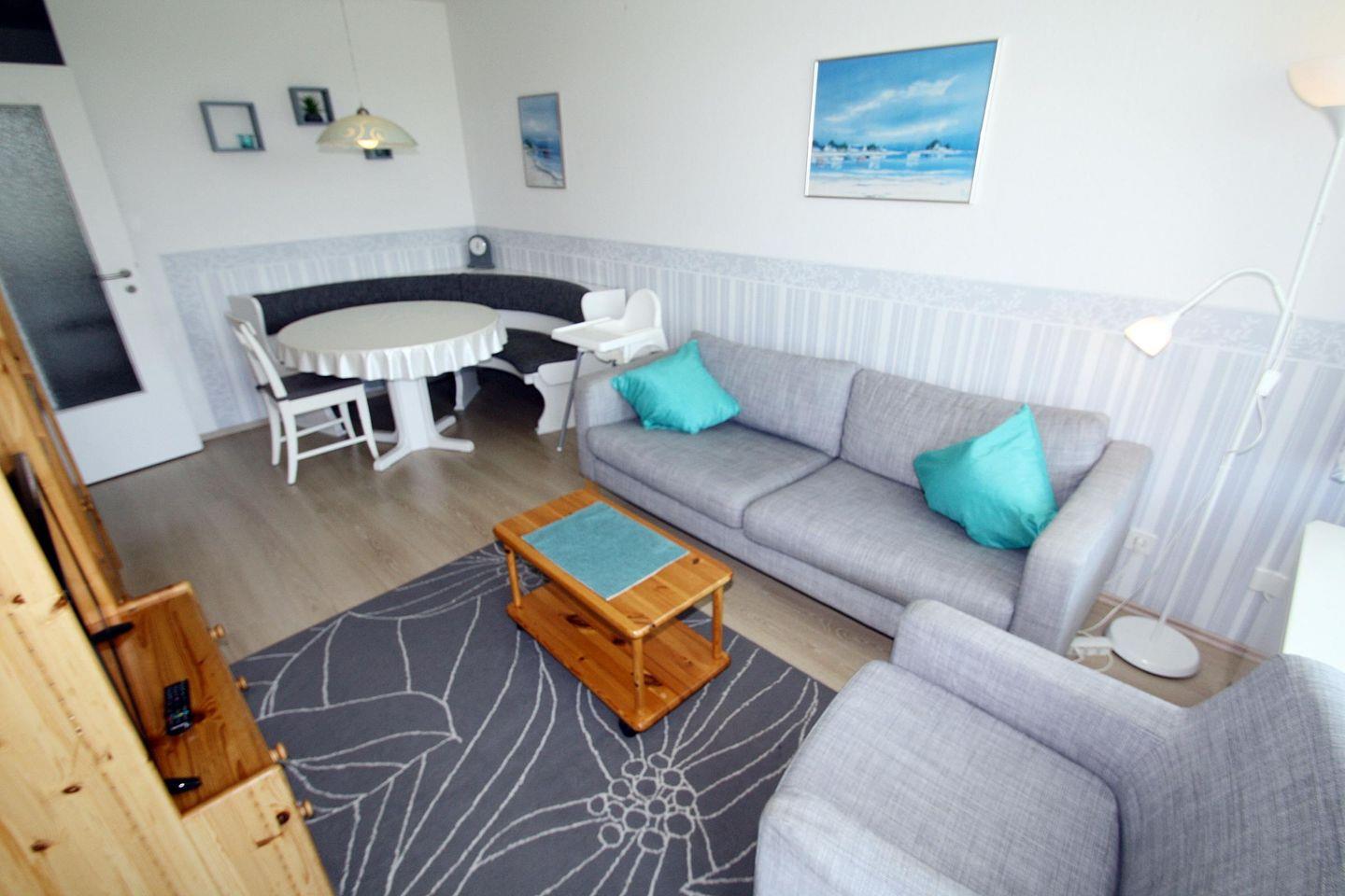 Wohnbereich mit Sitzgarnitur, TV/DVD, und integriertem Essbereich mit Eckbank.