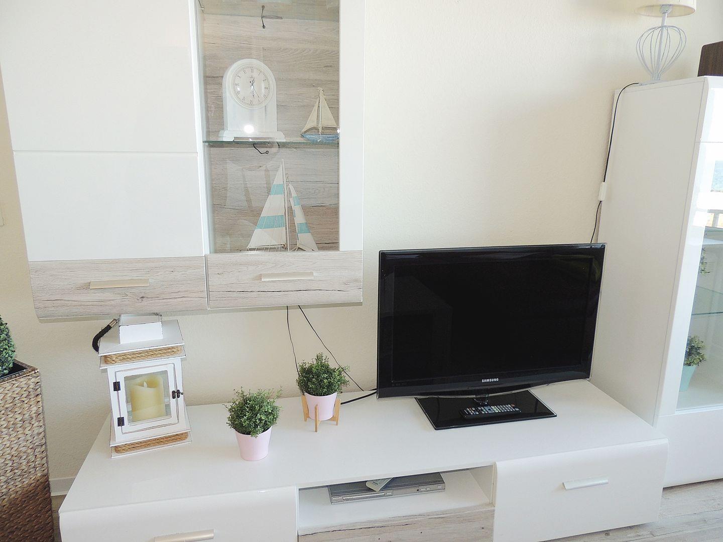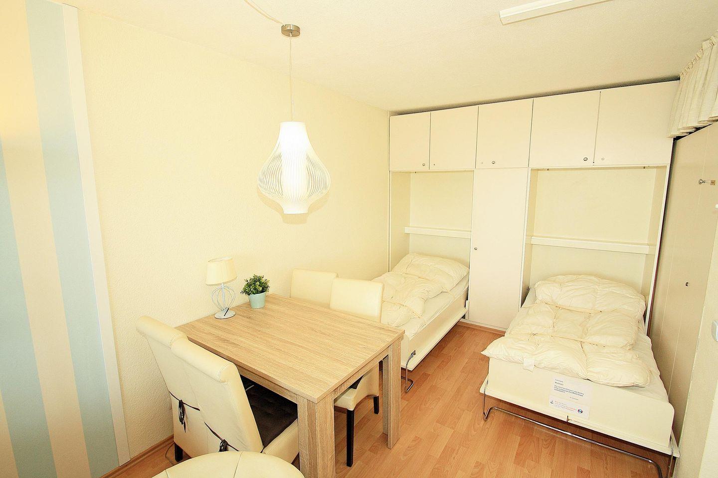 Wohnbereich mit Sofa und Sessel, gr. LCD-TV, DVD, schöne integrierte Essecke und 2 Einzelschrankbetten (90 x 200cm).