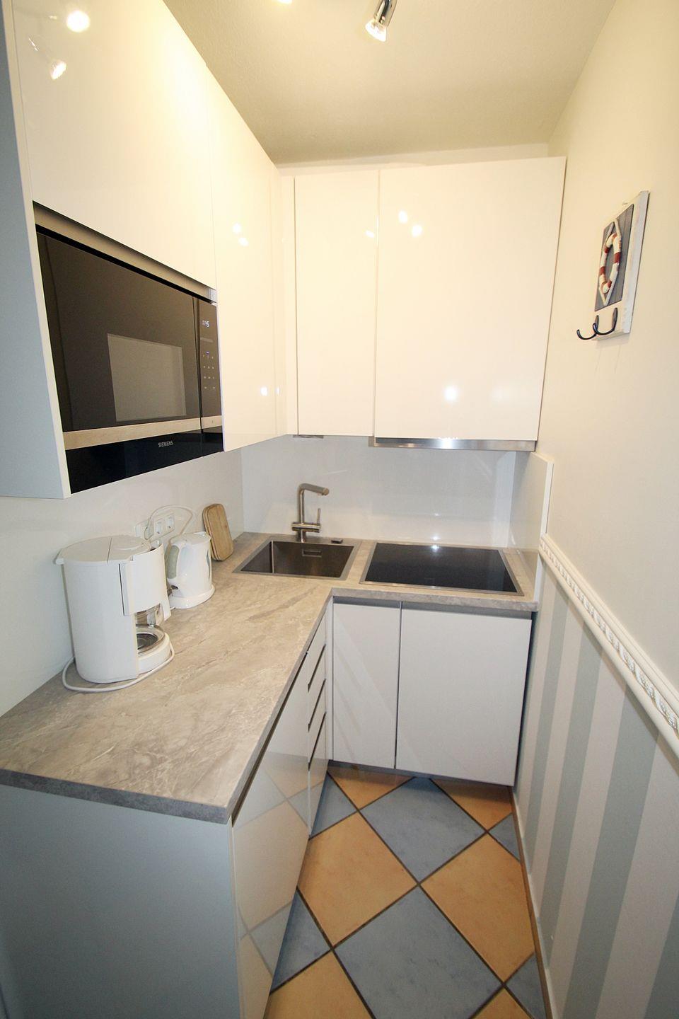 Küchenzeile mit Mikrowelle/Grill, 4er Ceranfeld, Kühlschrank u. Kaffeemaschine.