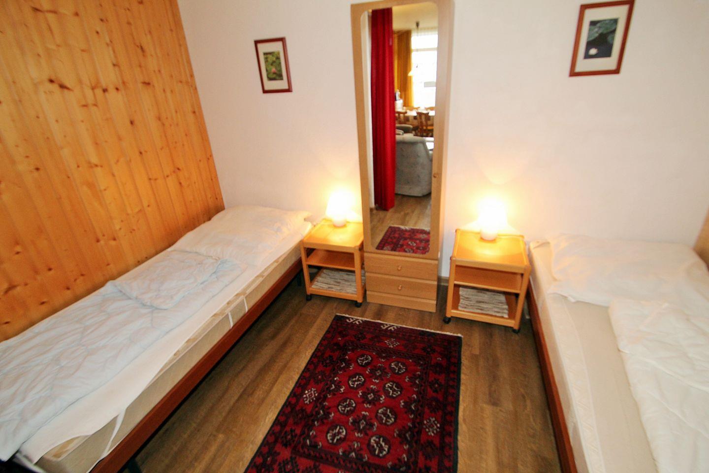 Schlafbereich mit zwei Einzelbetten und durch Vorhang zum Wohnbereich abtrennbar.