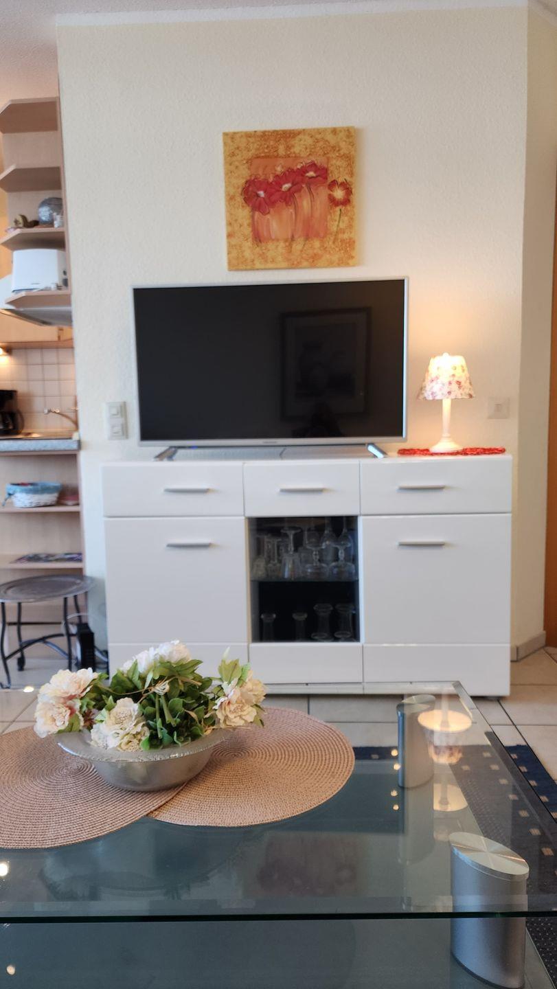 Der Wohnbereich ist mit einer hellen, komfortablen Couchgarnitur sowie einem gemütlichen Relax-Sessel samt Fußhocker, LCD-TV, HiFi-Anlage und integriertem Essbereich, ausgestattet.