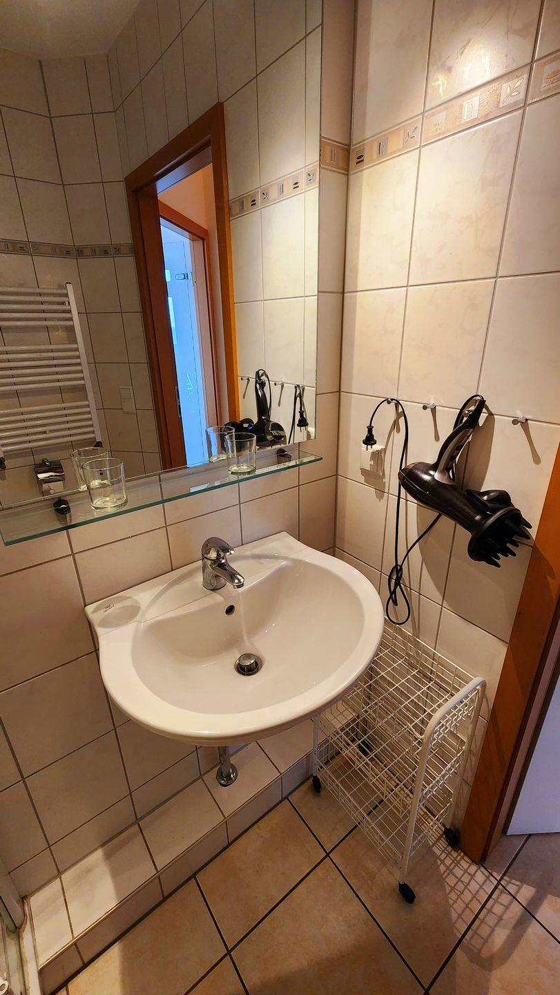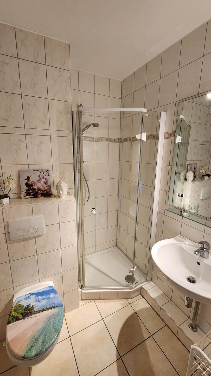 Das Badezimmer ist mit einer Duschkabine (hoher Einstieg) und WC ausgestattet.