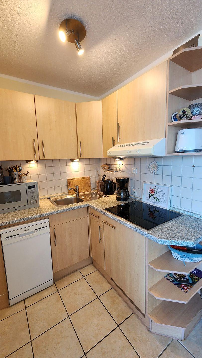 Die Küche ist mit einem 4-Plattenherd, einer Mikrowelle sowie einem Kühlschrank mit Gefrierfach und einer Kaffeemaschine ausgestattet.