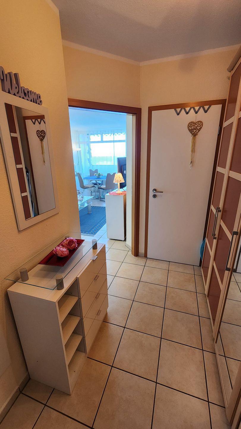 Beim Aufschließen treten Sie in einen hell, gefliesten Flurbereich mit großem Flurschrank, Kommode und Garderobe ein.