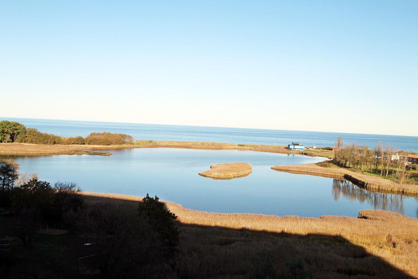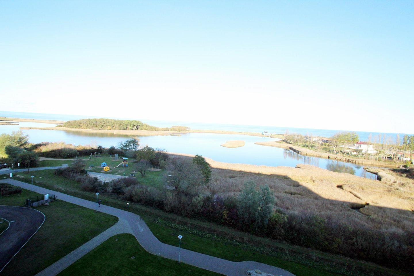 Helle Ferienwohnung in der 7. Etage mit Blick Richtung Insel Fehmarn über die Salzwiesen und Ostsee.