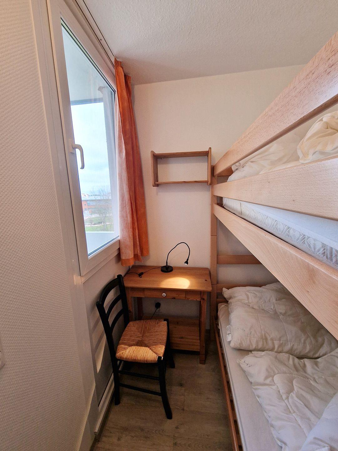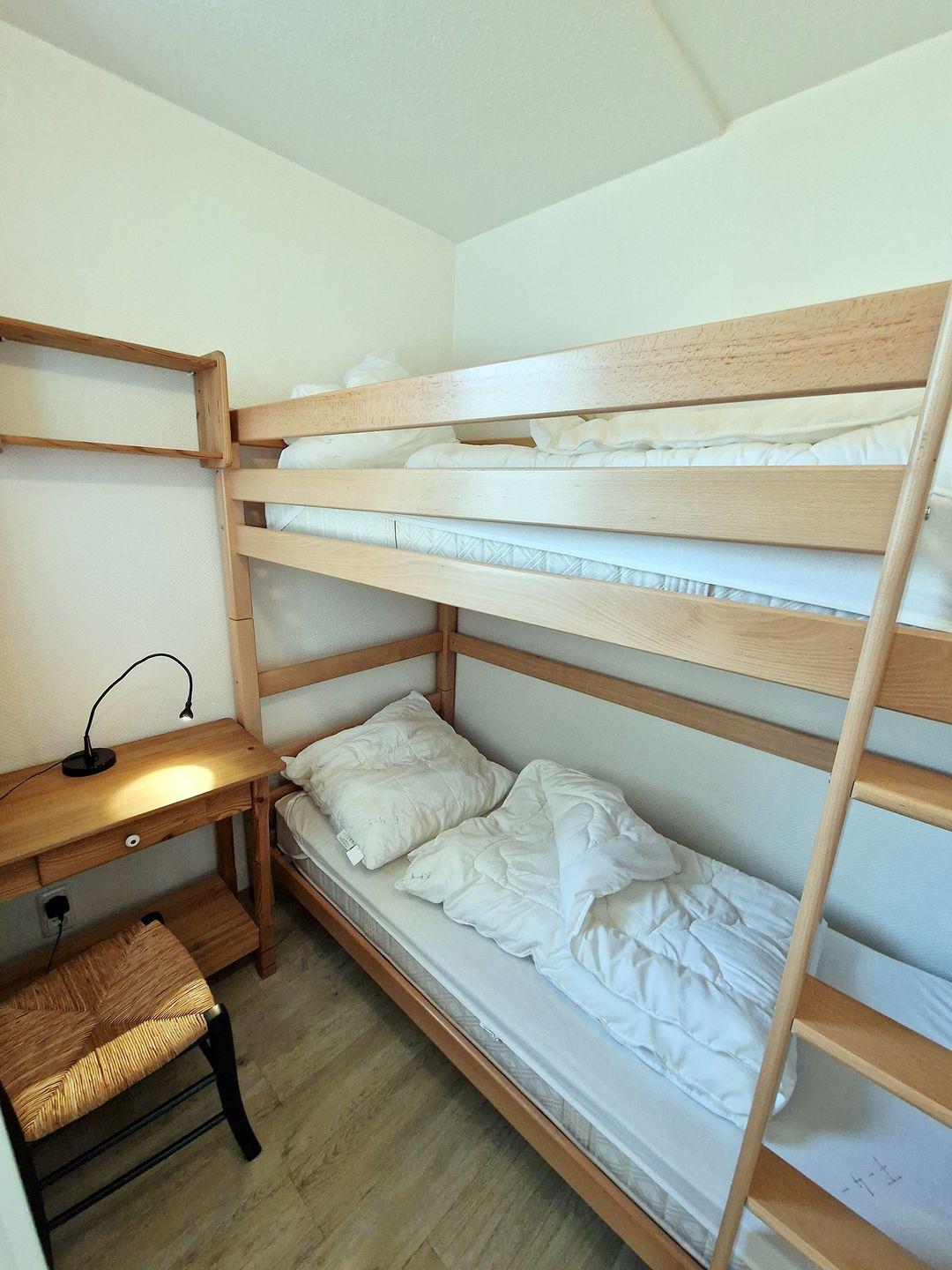 Das Schlafzimmer lässt sich durch eine Glasschiebetür verschließen und ist mit einem komfortablen Doppelbett (180x200 cm) für erholsame Nächte ausgestattet. Abgetrennt vom Hauptraum gibt es ein weiteres Zimmer mit Stockbett für zwei Kinder oder Erwachsene. Zu öffnende Fenster und die Balkontür verfügen über Fliegengitter.