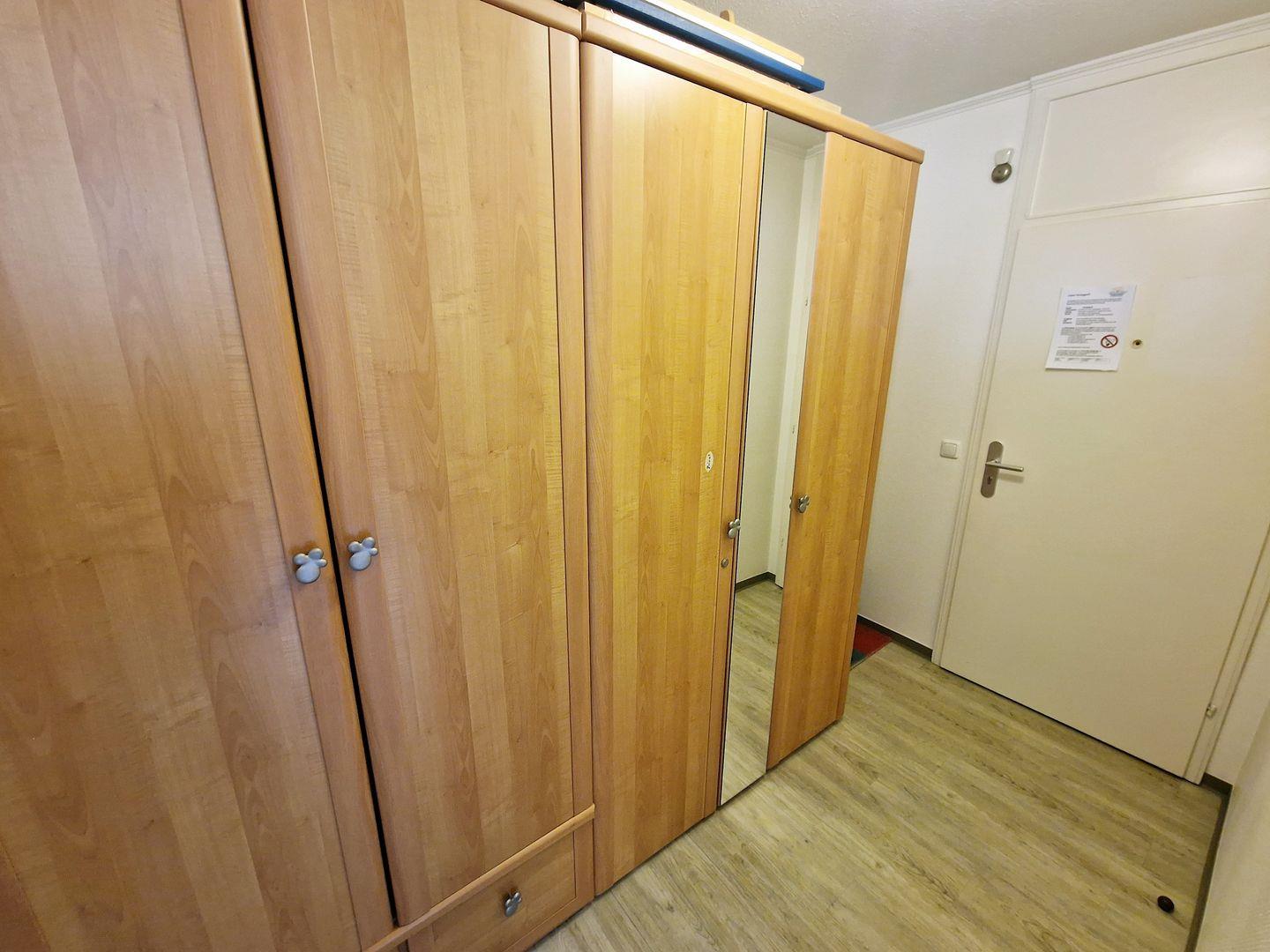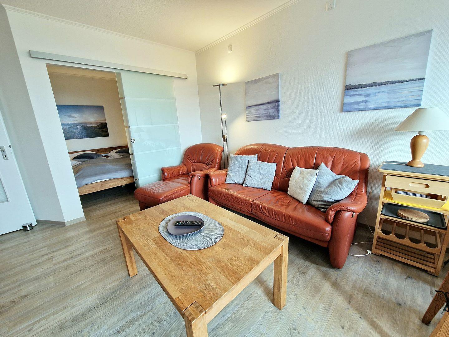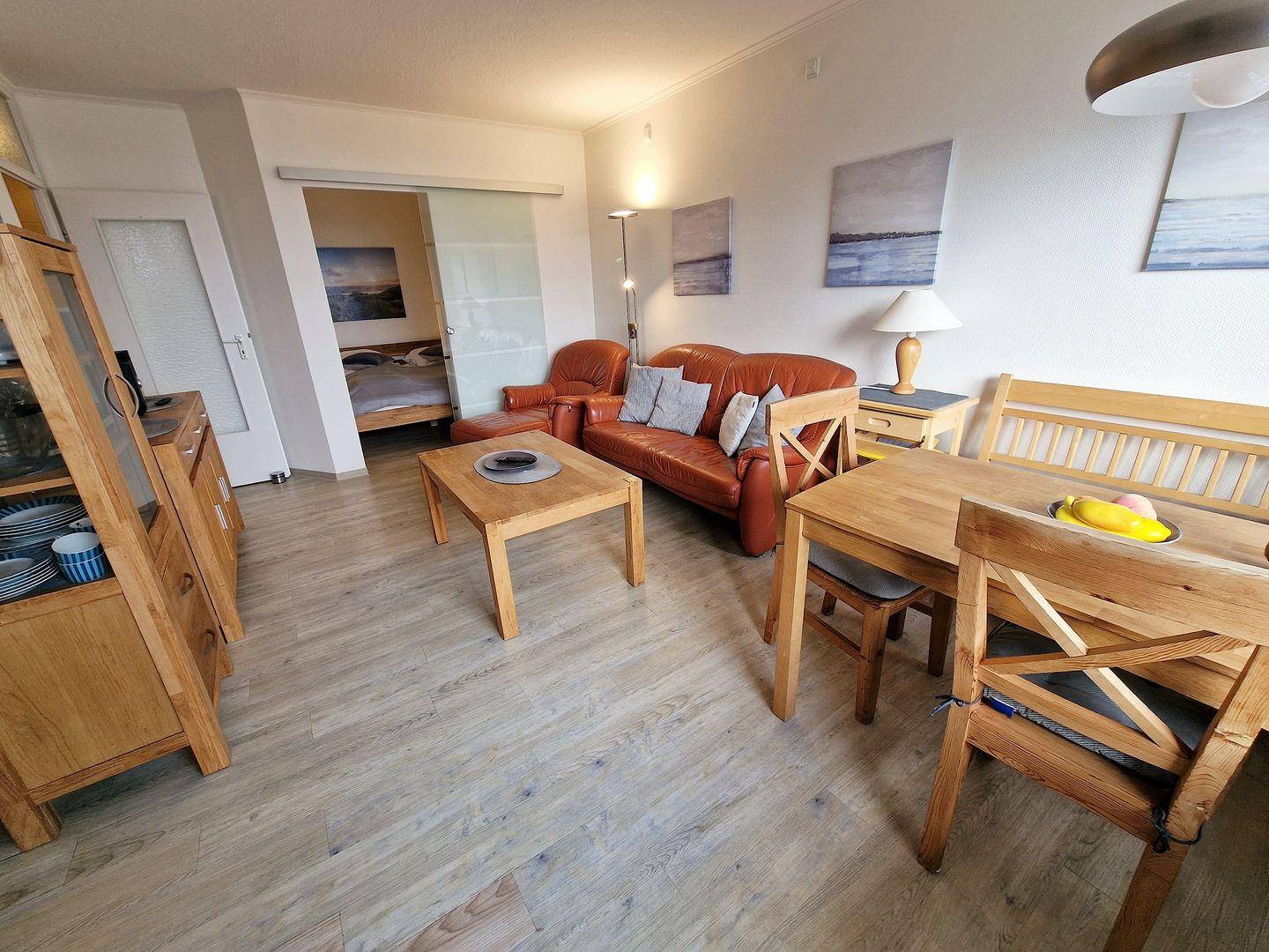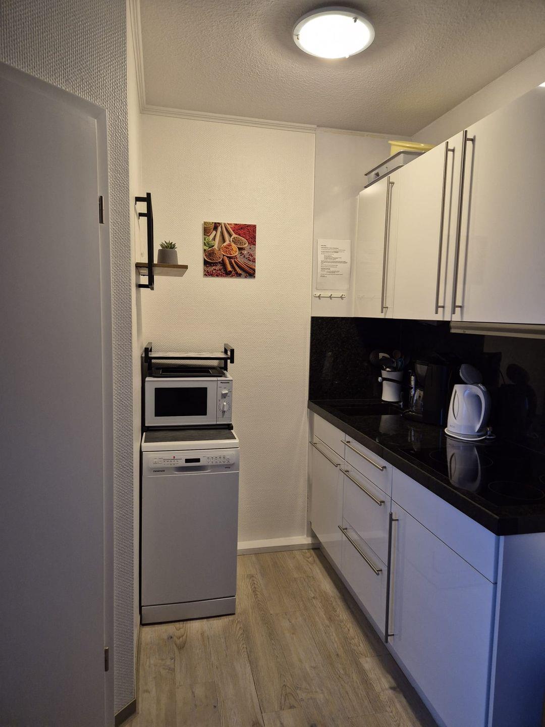 Die Ferienwohnung verfügt über ein einladendes Wohnzimmer mit einer Sofaecke und einem Essbereich, der Ihnen genügend Raum zum Entspannen und gemeinsamen Essen bietet. Hier können Sie gemütliche Abendessen genießen oder sich nach einem Tag am Strand zurücklehnen. Die Kochnische ist funktionell ausgestattet mit einem Cerankochfeld, einem Kühlschrank mit Gefrierfach, einer Mikrowelle, einer Spülmaschine sowie nützliche Küchenutensilien, damit Sie auch im Urlaub Ihre Mahlzeiten selber zubereiten können.