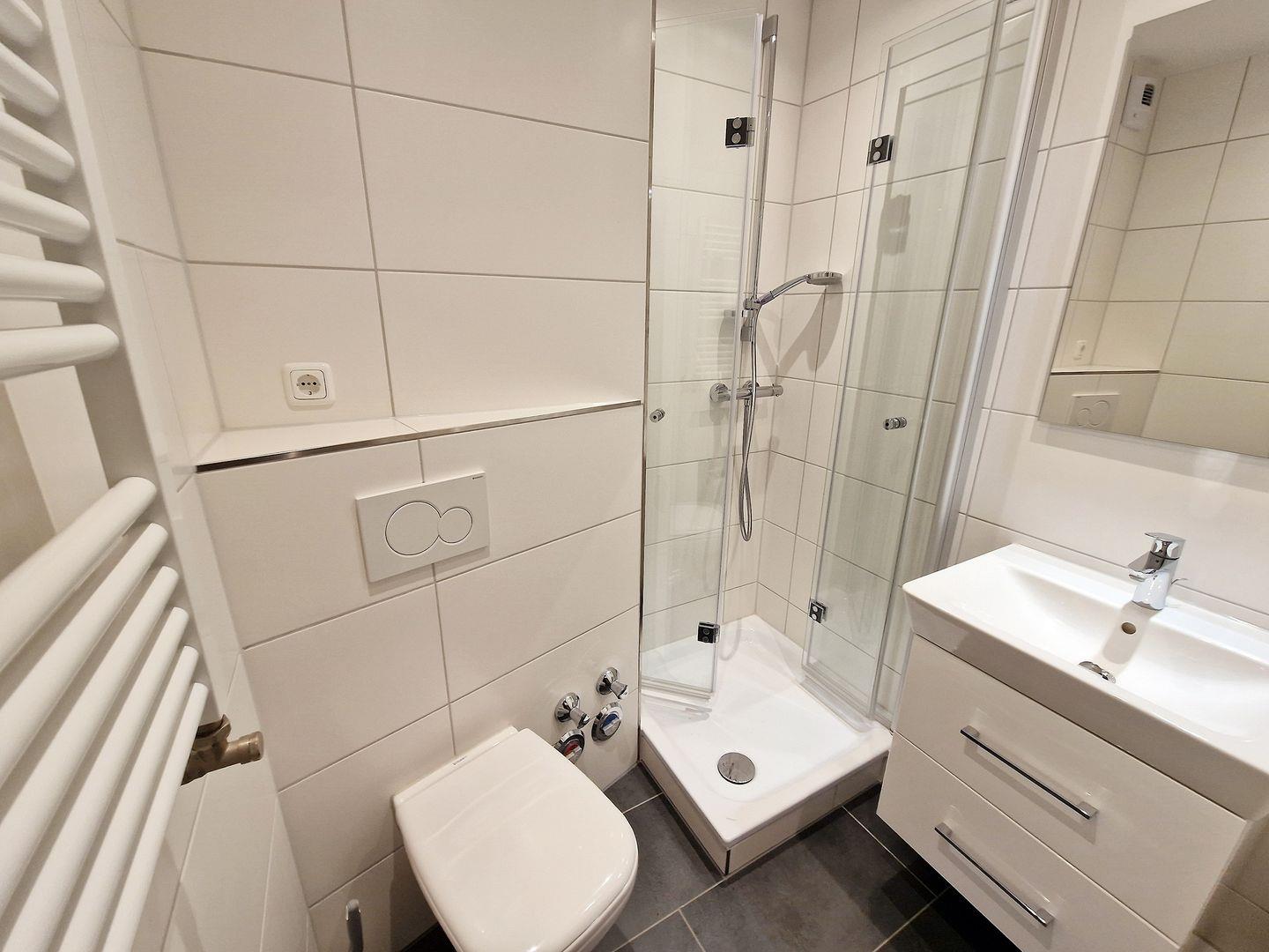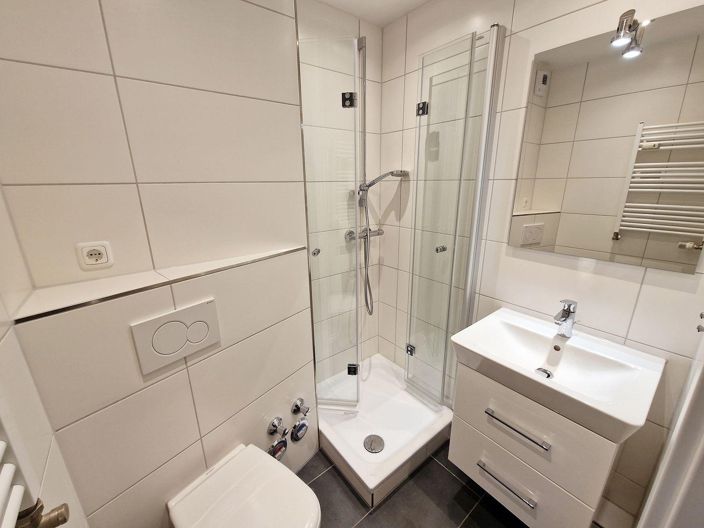 Das helle Badezimmer verfügt über eine Dusche mit niedrigem Einstieg und Glastüre. Für Ihr Wohlbefinden ist die gesamte Wohnung mit Zentralheizung ausgestattet, sodass Sie auch an kühleren Tagen gemütliche Stunden verbringen können.