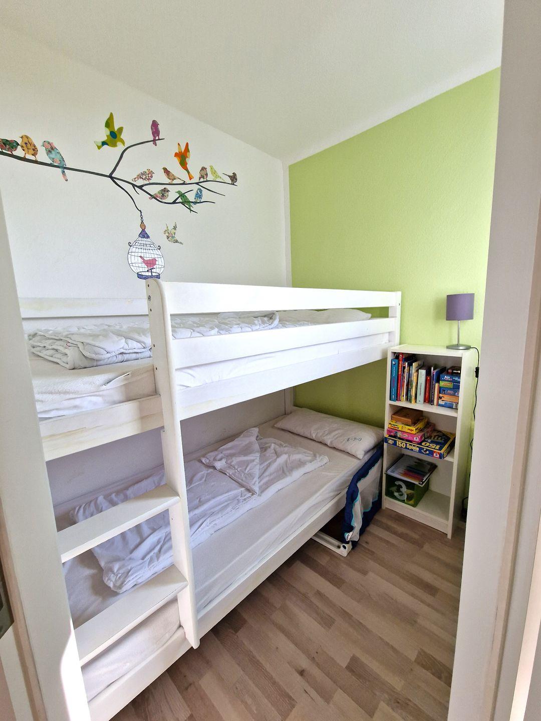 Im Kinderzimmer befindet sich ein helles Etagenbett (0,90 x 2,00m), welches auch von Kleinkindern genutzt werden kann, da ein Fallschutzgitter vorhanden ist. Das obere Bett des Etagenbetts ist ausschließlich für Kinder geeignet. Ein Kinderhochstuhl wird für die Kleinen ebenfalls zur Verfügung gestellt.