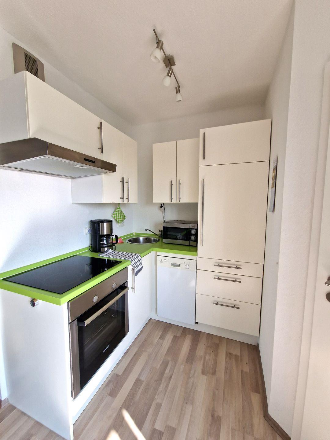 Die voll ausgestattete und helle Einbauküche verfügt über ein 4er-Ceranfeld, einen Backofen, eine Spülmaschine und vieles mehr.