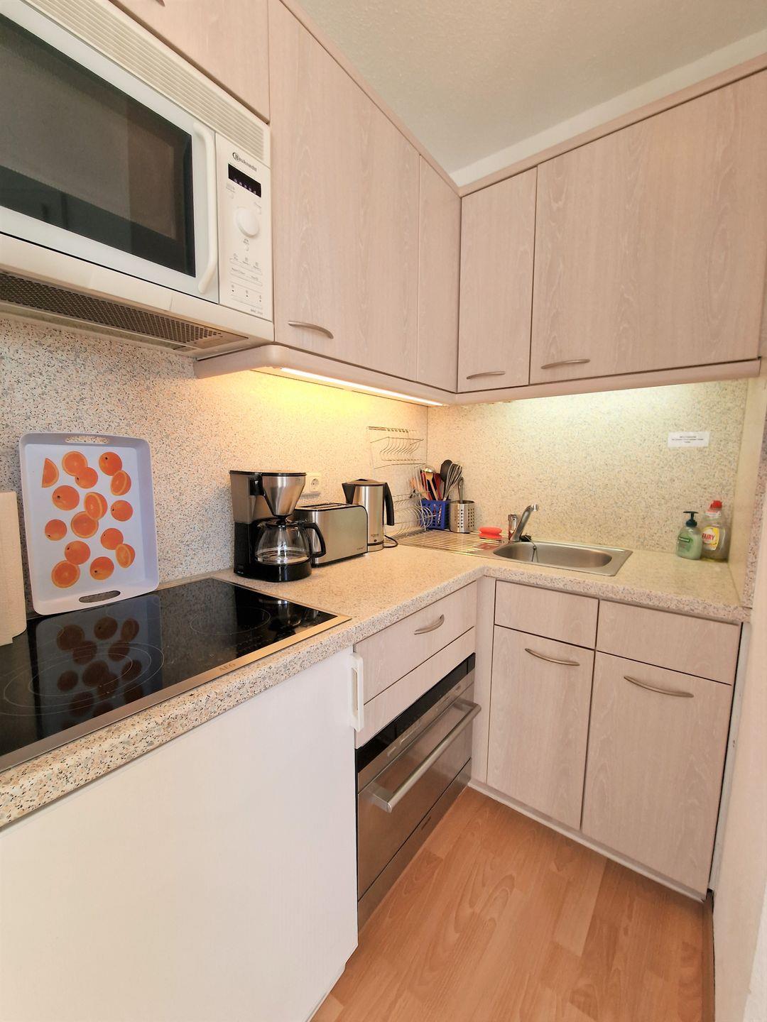 Küchenzeile mit Cerankochfeld, kleine Spülmaschine und Mikrowelle.