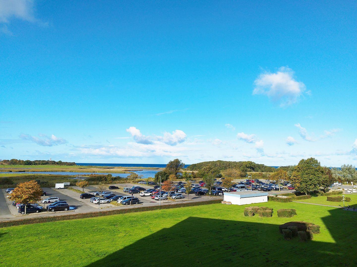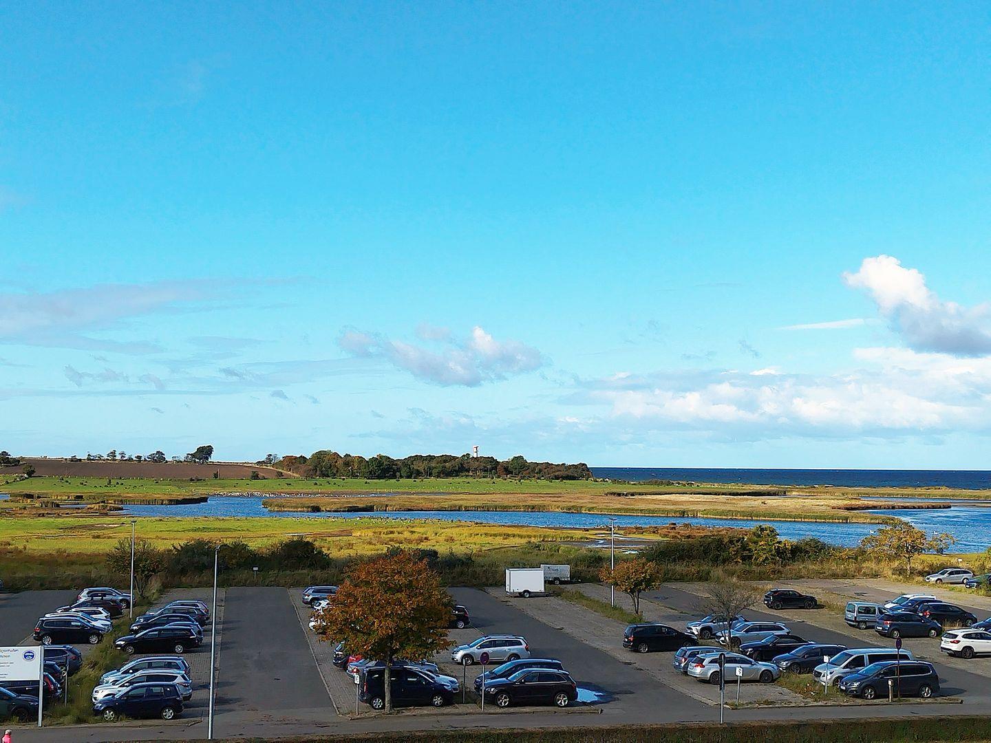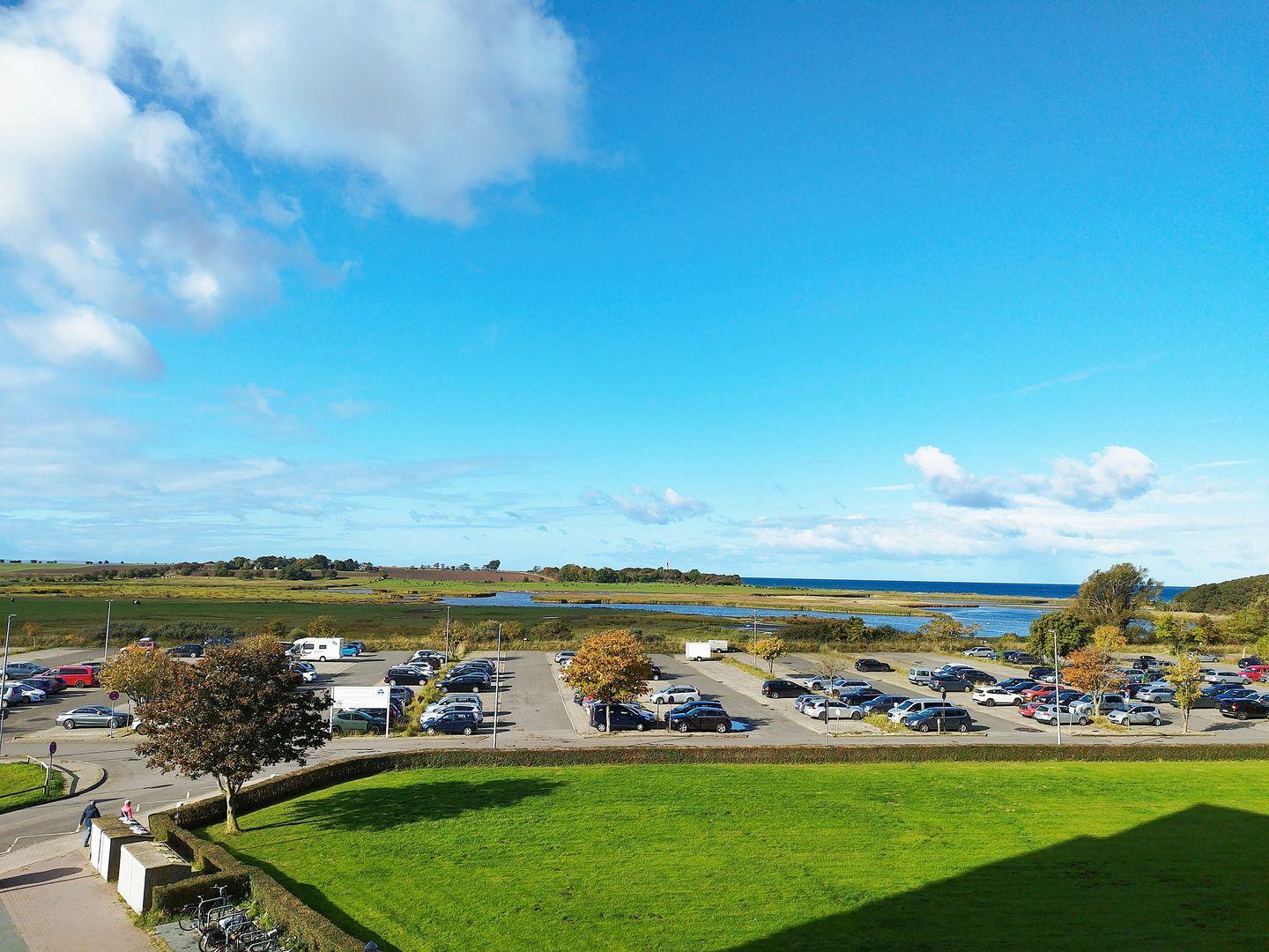 Helle und geradlinige Ferienwohnung in der 3. Etage mit Balkon zur Westseite und Seeblick über das Naturschutzgebiet in Richtung Ostsee.