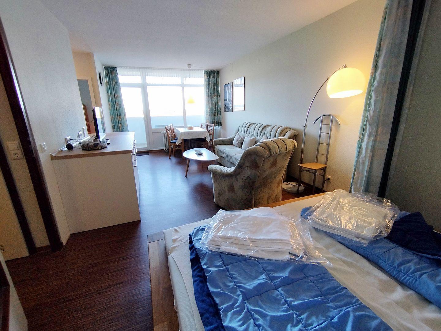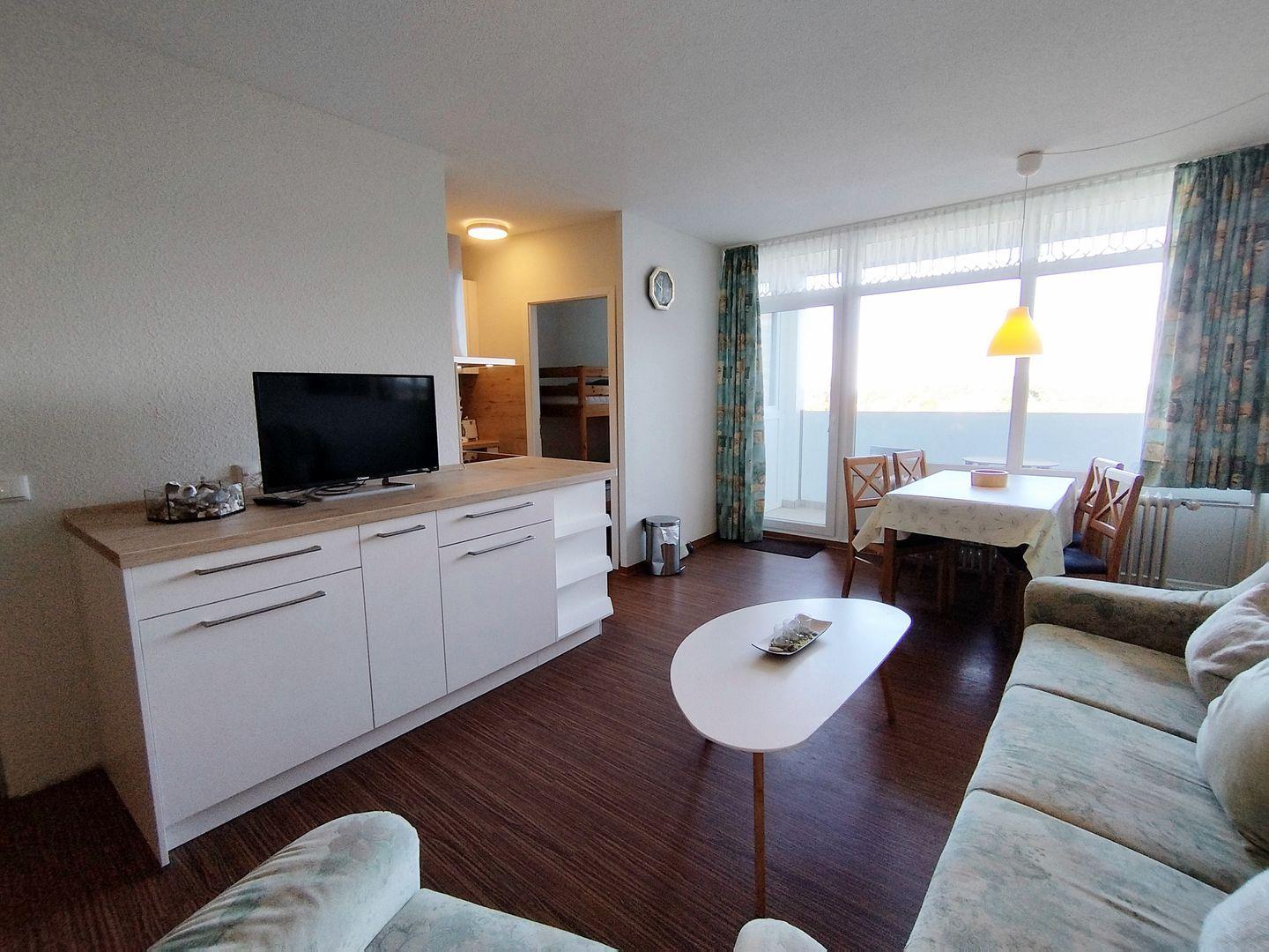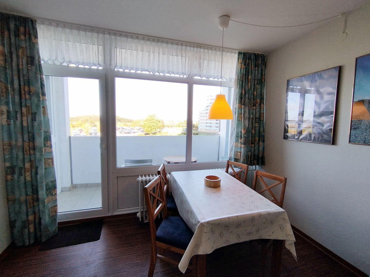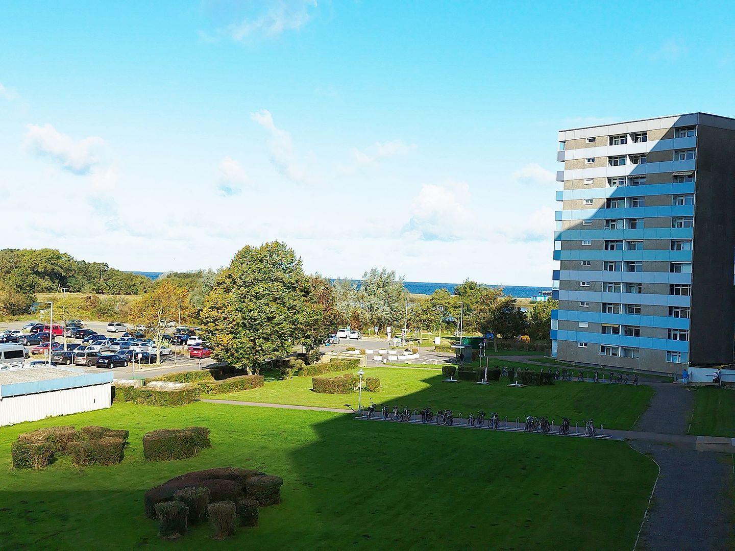 Helle und geradlinige Ferienwohnung in der 3. Etage mit Balkon zur Westseite und Seeblick über das Naturschutzgebiet in Richtung Ostsee.